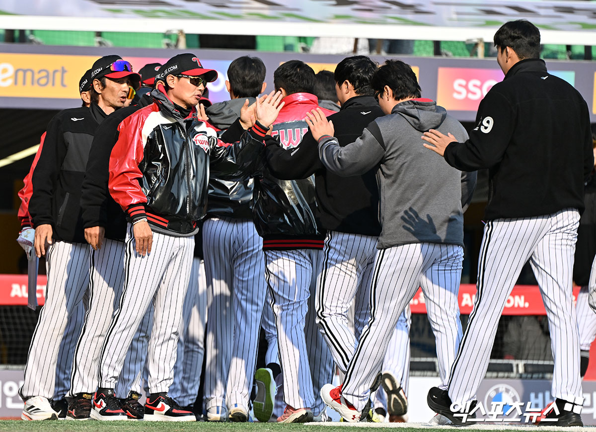 이날 경기에서 승리한 LG 염경엽 감독이 선수들과 하이파이브를 하고 있다.
