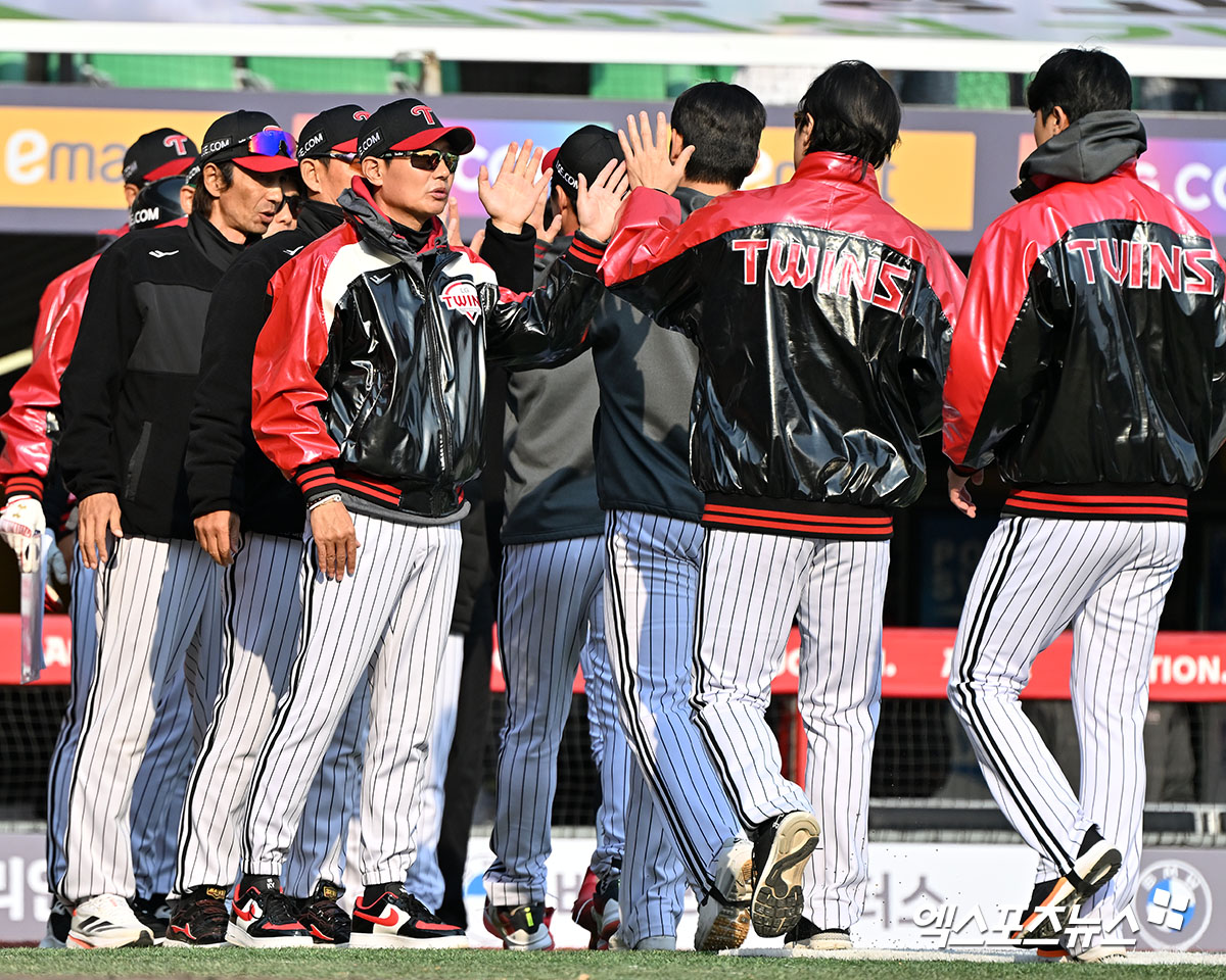 20일 오후 인천SSG랜더스필드에서 열린 '2026 신한 SOL Bank KBO리그' LG 트윈스와 SSG 랜더스의 시범경기, LG가 SSG에 9:7로 승리했다.  이날 경기에서 승리한 LG 염경엽 감독이 선수들과 하이파이브를 하고 있다. 인천, 김한준 기자