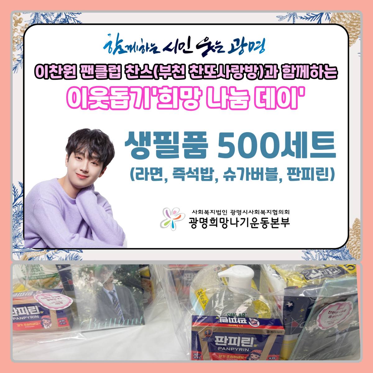 최근 이찬원 팬클럽 '찬스 부천 찬또사랑방’은 광명시사회복지협의회 광명희망나기운동본부에 약 540만 원 상당의 생필품 500세트를 전달했다고 밝혔다.