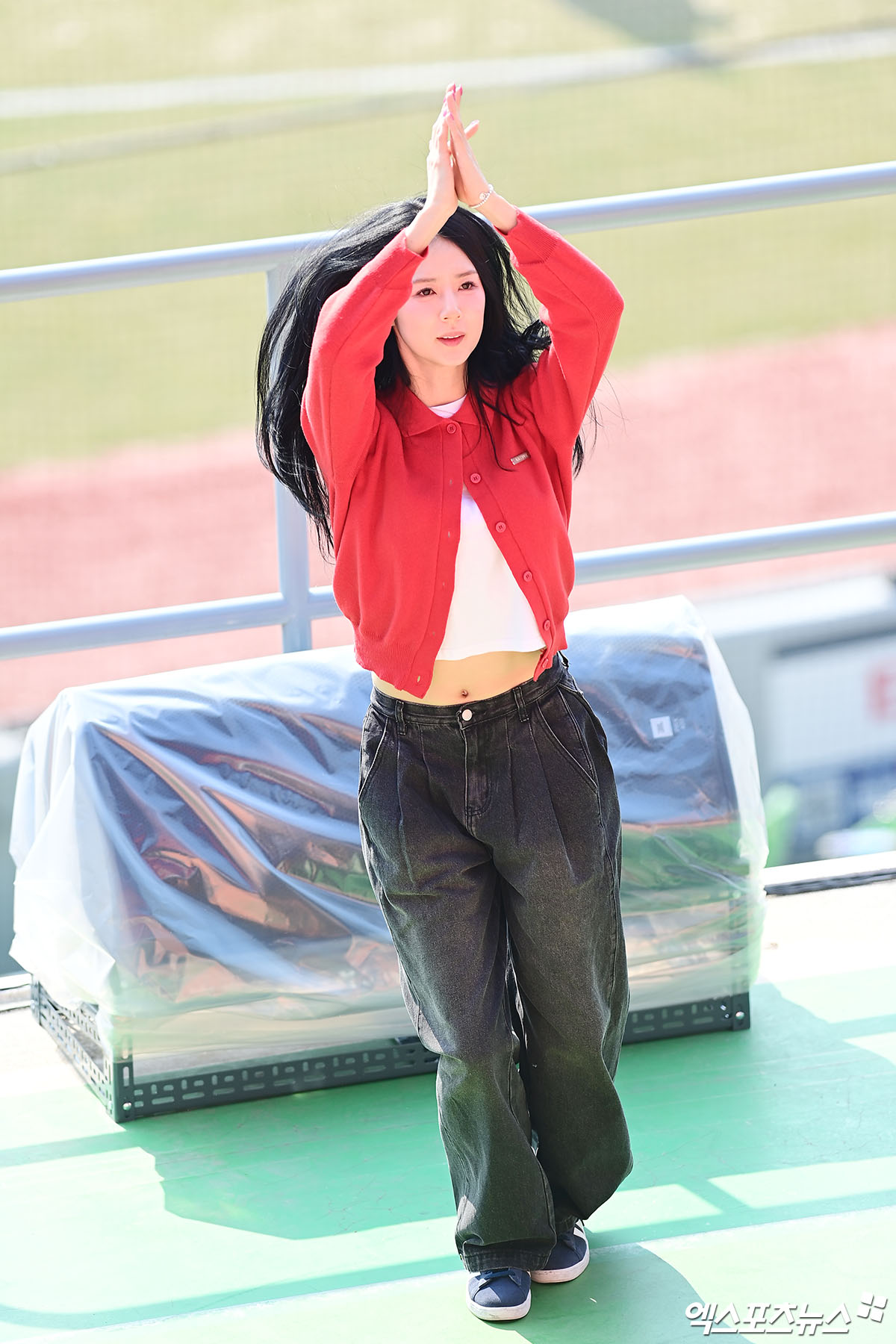 (엑스포츠뉴스 잠실, 박지영 기자) 21일 오후 서울 송파구 잠실야구장에서 열리는 '2026 신한 SOL Bank KBO리그 시범경기' KIA 타이거즈와 두산 베어스의 경기에 앞서 두산 치어리더 박기량이 리허설을 하고 있다.