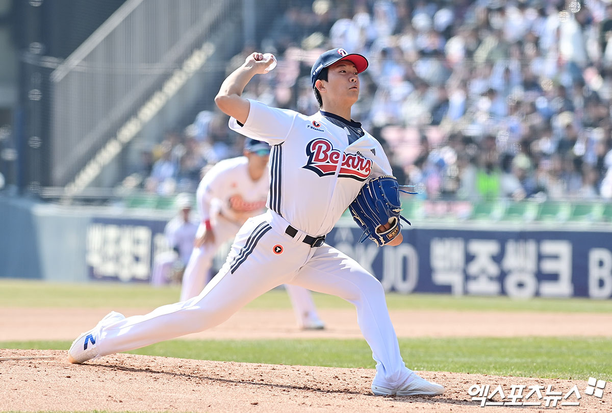 (엑스포츠뉴스 잠실, 박지영 기자) 21일 오후 서울 송파구 잠실야구장에서 열린 '2026 신한 SOL Bank KBO리그 시범경기' KIA 타이거즈와 두산 베어스의 경기, 6회초 두산 최민석이 역투하고 있다.