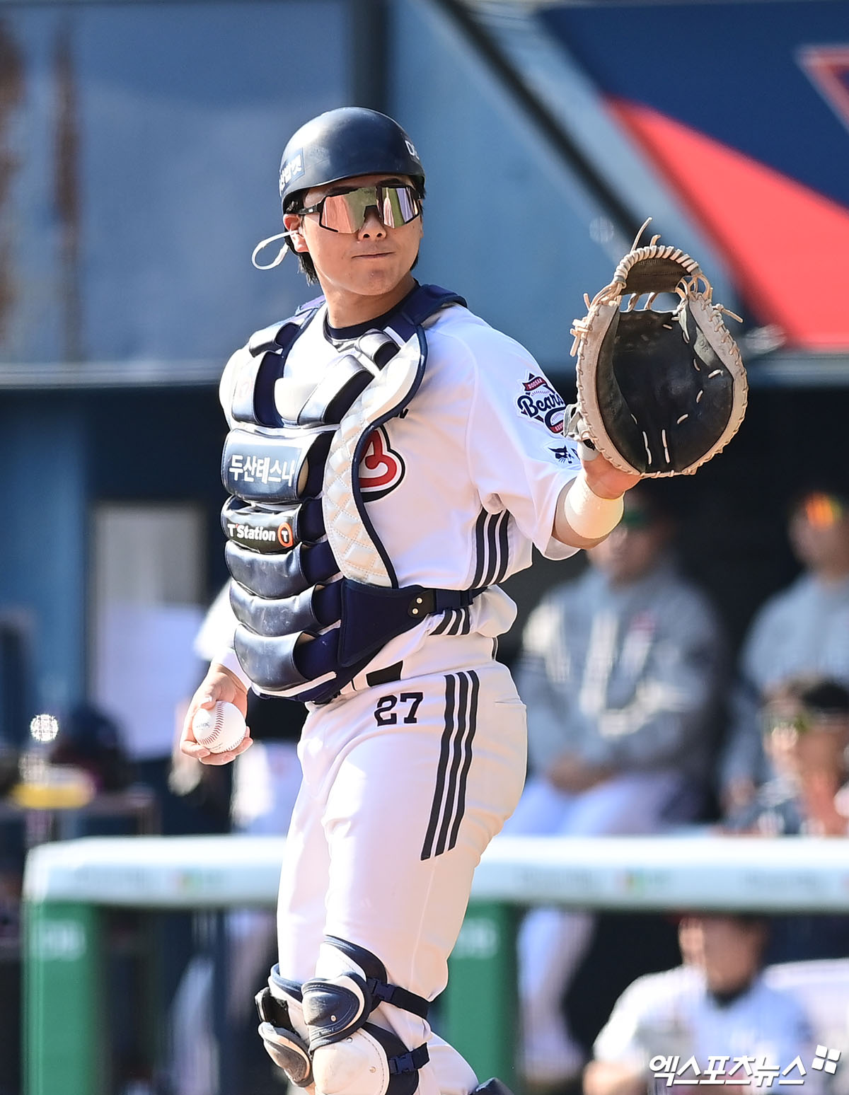 (엑스포츠뉴스 잠실, 박지영 기자) 21일 오후 서울 송파구 잠실야구장에서 열린 '2026 신한 SOL Bank KBO리그 시범경기' KIA 타이거즈와 두산 베어스의 경기, 8회초 무사 1,2루 두산 포수 윤준호가 KIA 데일의 파울 플라이 타구를 잡은 뒤 미소짓고 있다.