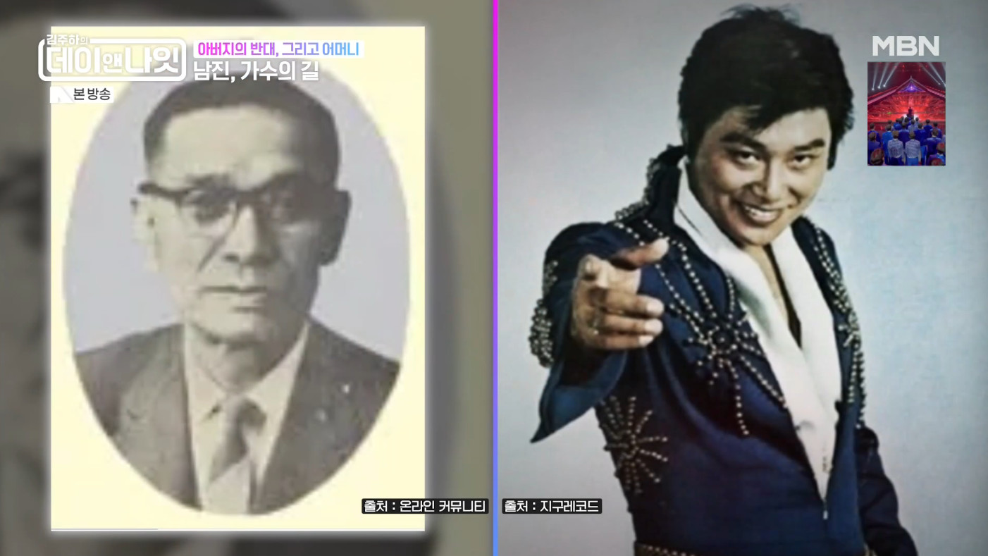 가수로 성공한 모습을 보지 못하고 돌아가신 아버지의 이야기도 털어놨다. 아버지가 신문사 사장에 국회의원 출신으로 목포에서 금수저로 유명했다는 남진은 "아버지가 내가 노래하는 걸 모르셨다. 당시 병원에 오래 계셨었다. 어느 날 텔레비전을 보는데 무명 가수로 나간 걸 보셨다. 서울에서 대학을 잘 다니고 있는 줄 알았는데 아니었으니 쇼크를 받으셨다"고 회상했다.
