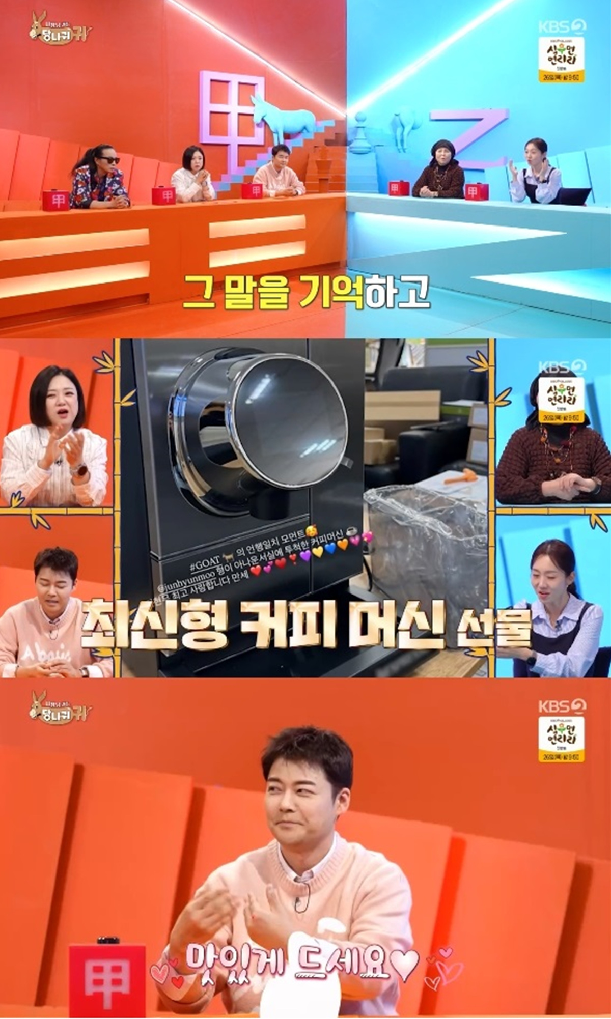 전현무는 앞서 대상 떡을 돌리러 KBS 아나운서실을 방문했을 당시 커피머신이 오래됐다는 얘기를 듣고 커피머신을 선물한 상태였다.