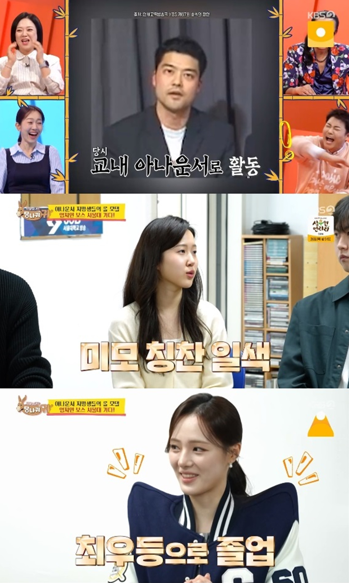 엄지인은 서울대 출신인 후배아나운서 김진웅, 박효진과 함께 서울대 방송부실을 찾았다.
