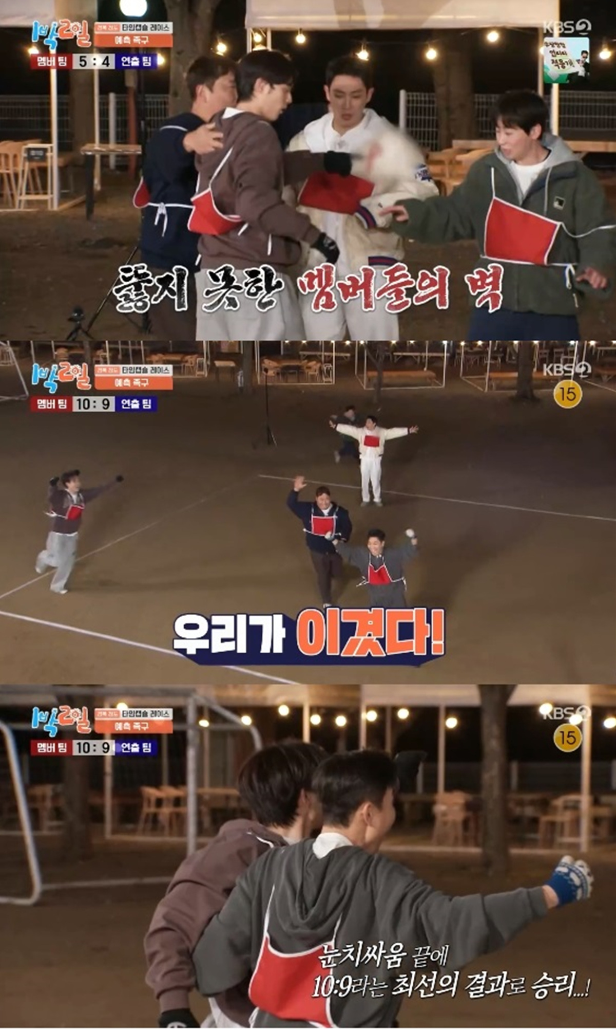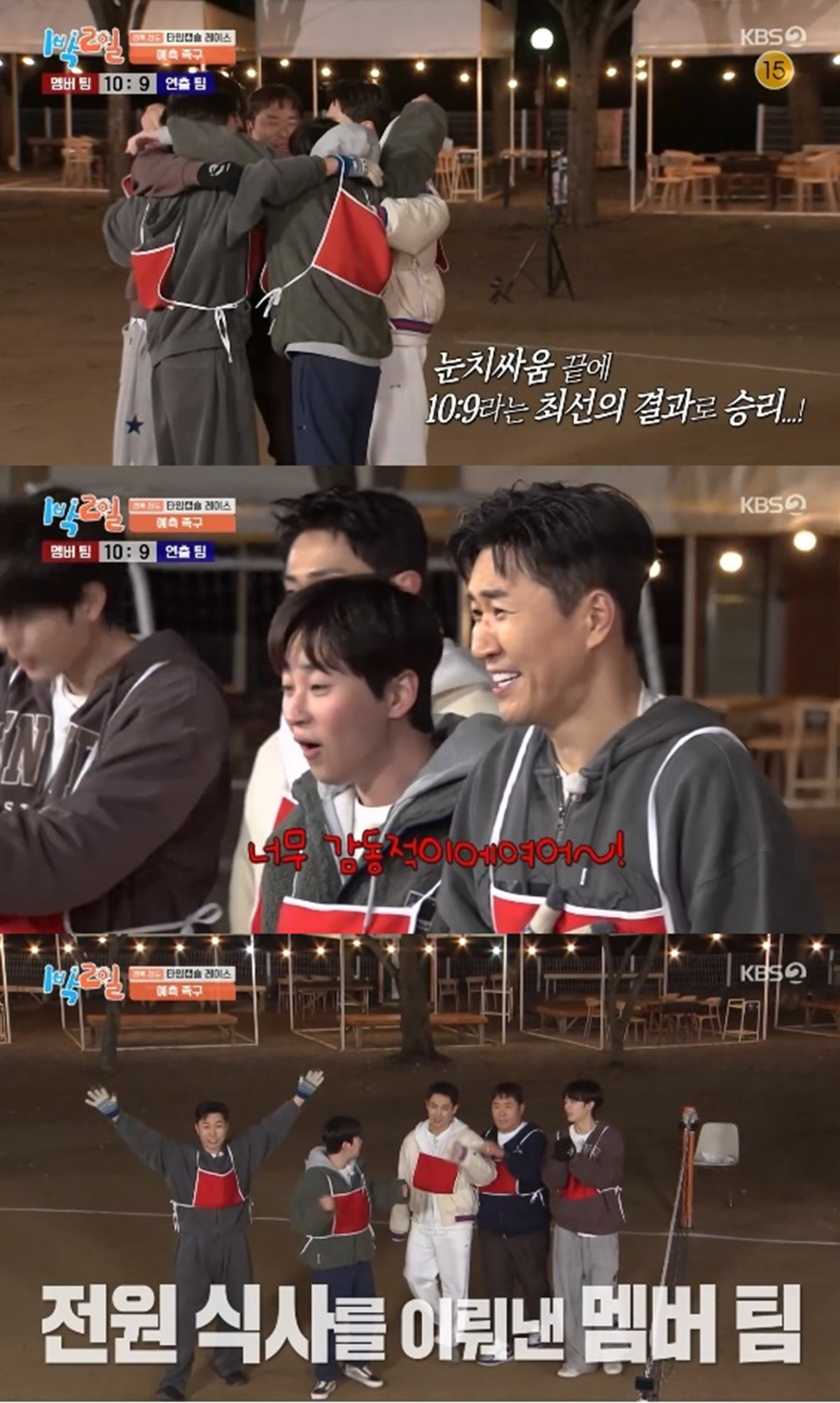 멤버들은 연출 팀의 공격이 라인아웃되는 행운 속에 10대 9로 승리하며 전원식사를 이뤄냈다.