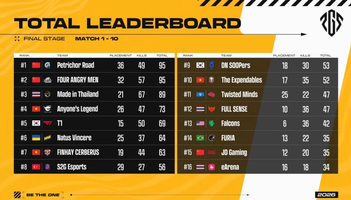 하위 스테이지에서 생존한 16개 팀이 나선 파이널 2일 차. 경기 결과, 95점(순위 점수 36점)의 페트리코 로드가 1위에 올랐다. 그리고 뒤를 이어 95점(순위 점수 32점)의 포 앵그리 멘이 2위, 89점의 메이드 인 타일랜드가 3위, 73점의 애니원스 레전드가 4위로 상위권을 형성했다.