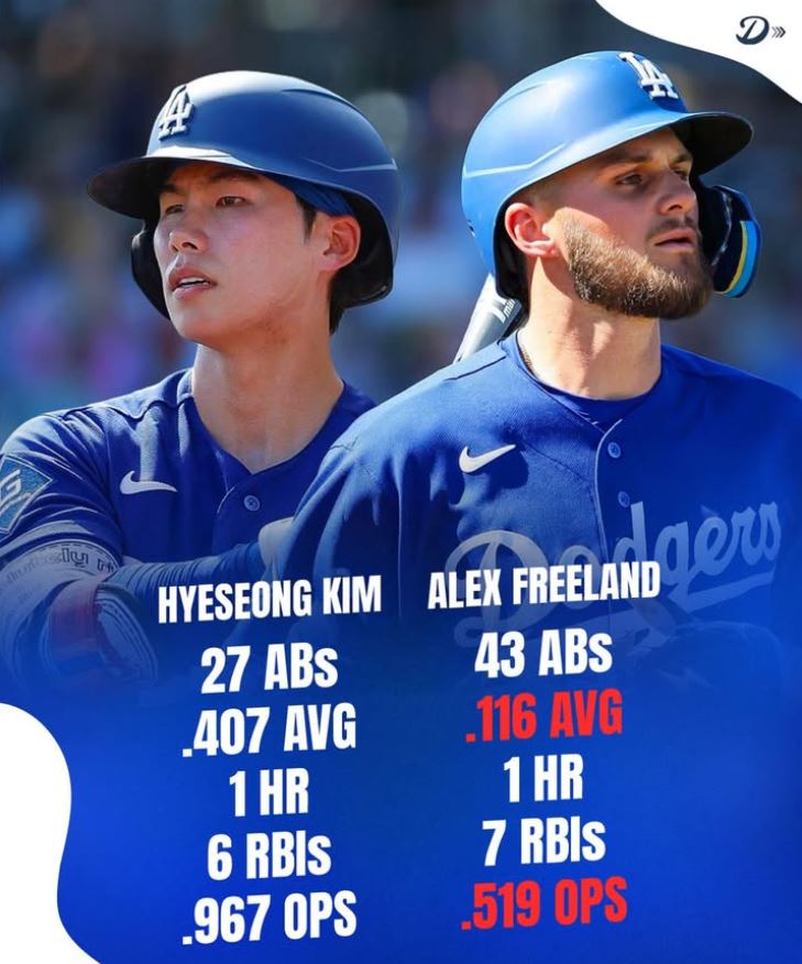반면 개막 로스터 경쟁에서 승리한 알렉스 프릴랜드는 전혀 다른 흐름이었다. 18경기에서 타율 0.116(43타수 5안타)에 그쳤고, OPS 역시 0.519로 김혜성과 큰 차이를 보였다.