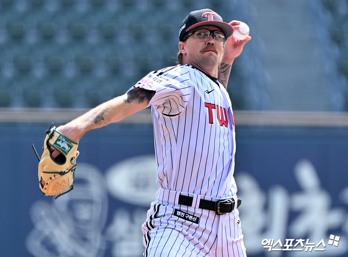 (엑스포츠뉴스 잠실, 김한준 기자) 23일 오후 서울 송파구 잠실야구장에서 열린 '2026 신한 SOL Bank KBO리그' 키움 히어로즈와 LG 트윈스의 시범경기, 1회초 LG 웰스가 투구 준비를 하고 있다.