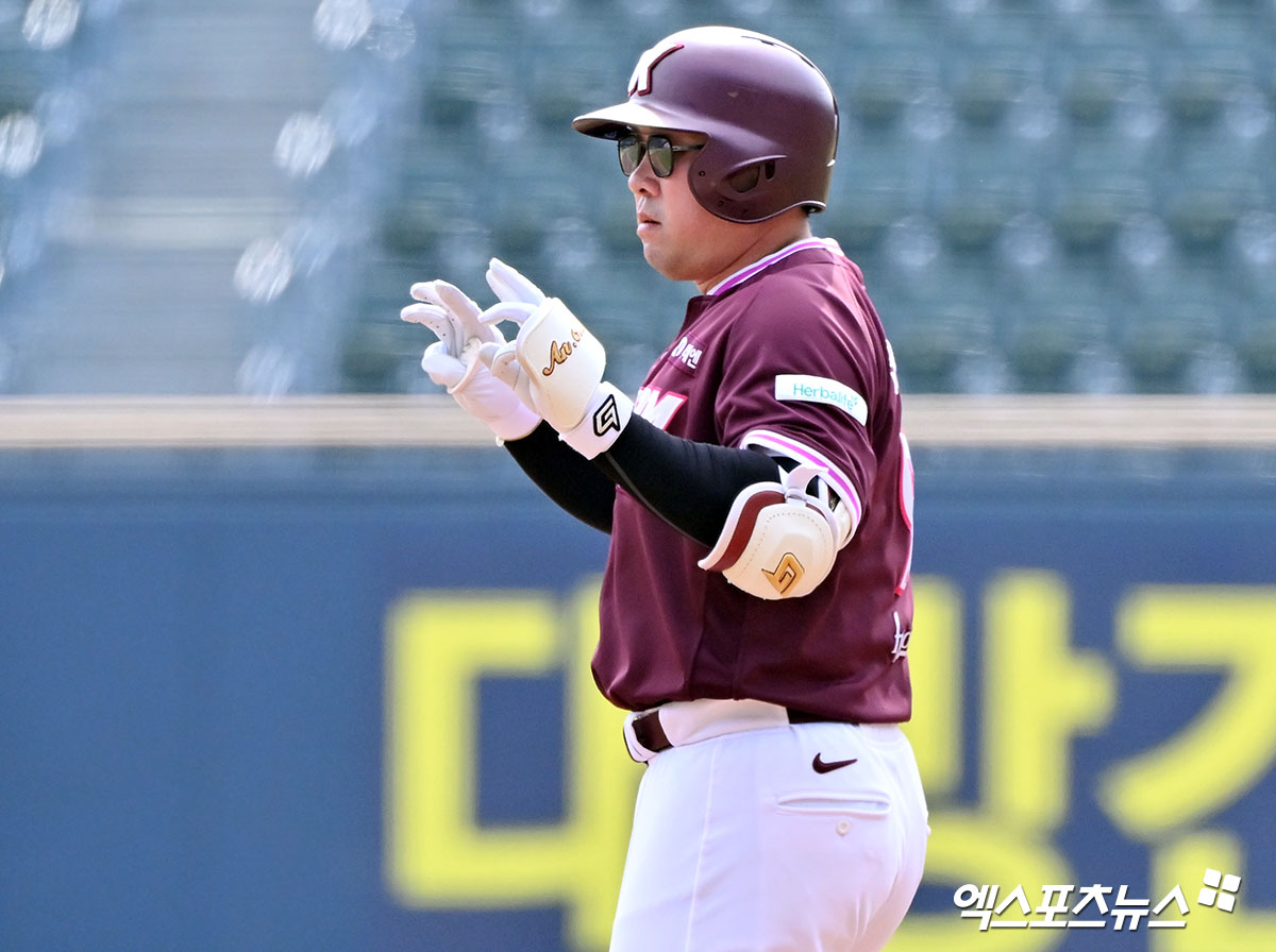 (엑스포츠뉴스 잠실, 김한준 기자) 23일 오후 서울 송파구 잠실야구장에서 열린 '2026 신한 SOL Bank KBO리그' 키움 히어로즈와 LG 트윈스의 시범경기, 3회초 2사 2루 키움 안치홍이 1타점 적시타를 날리고 있다.