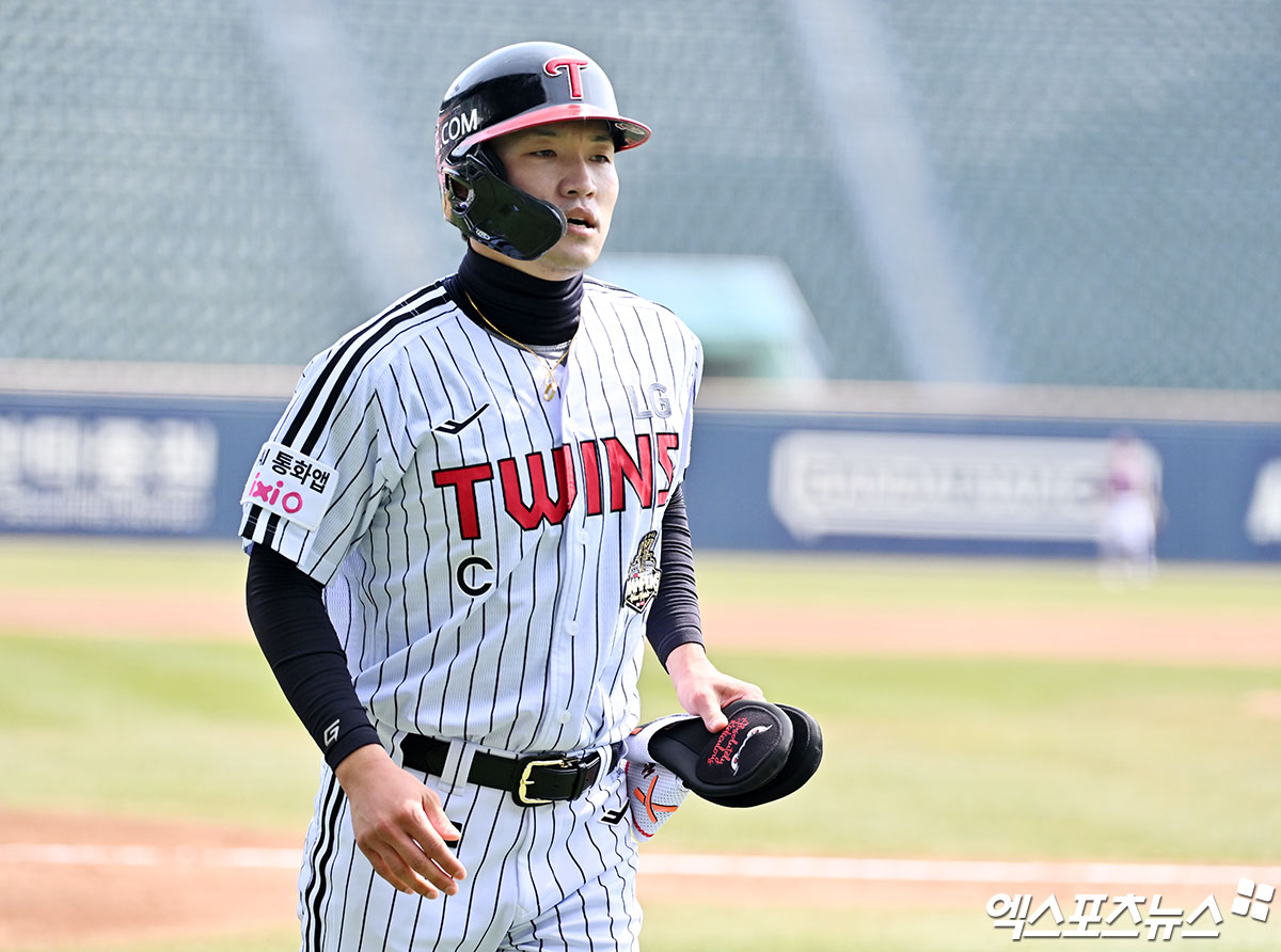 (엑스포츠뉴스 잠실, 김한준 기자) 23일 오후 서울 송파구 잠실야구장에서 열린 '2026 신한 SOL Bank KBO리그' 키움 히어로즈와 LG 트윈스의 시범경기, 4회말 2사 3루 LG 박해민이 오스틴의 1타점 적시타때 득점에 성공하고 있다.