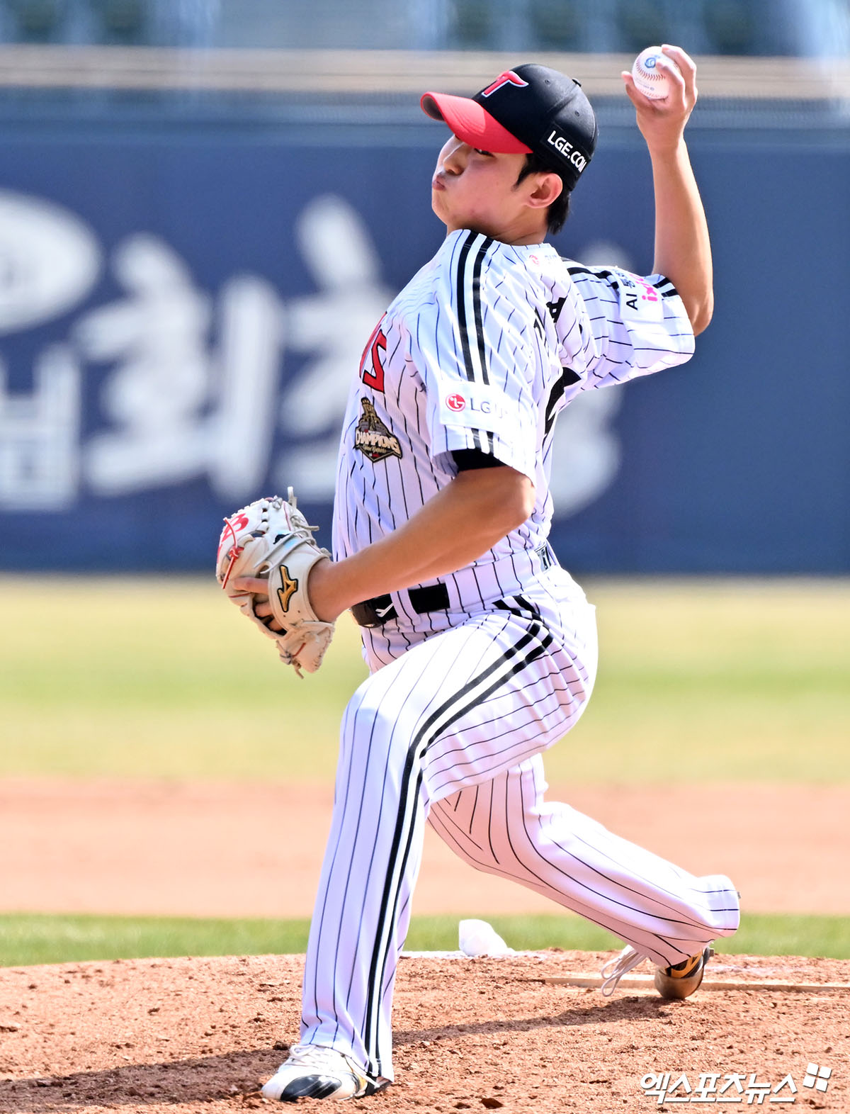 (엑스포츠뉴스 잠실, 김한준 기자) 23일 오후 서울 송파구 잠실야구장에서 열린 '2026 신한 SOL Bank KBO리그' 키움 히어로즈와 LG 트윈스의 시범경기, 6회초 LG 김영우가 공을 힘차게 던지고 있다.