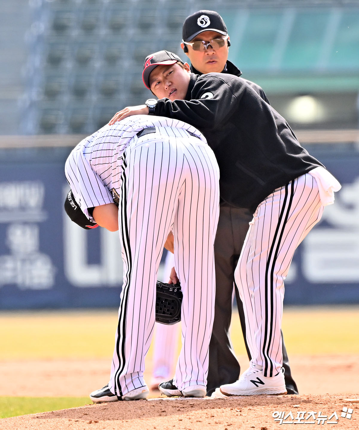 (엑스포츠뉴스 잠실, 김한준 기자) 23일 오후 서울 송파구 잠실야구장에서 열린 '2026 신한 SOL Bank KBO리그' 키움 히어로즈와 LG 트윈스의 시범경기, 7회초 무사 만루 LG 김진성이 키움 최주환의 타구에 맞은 후 고통스러워하고 있다.