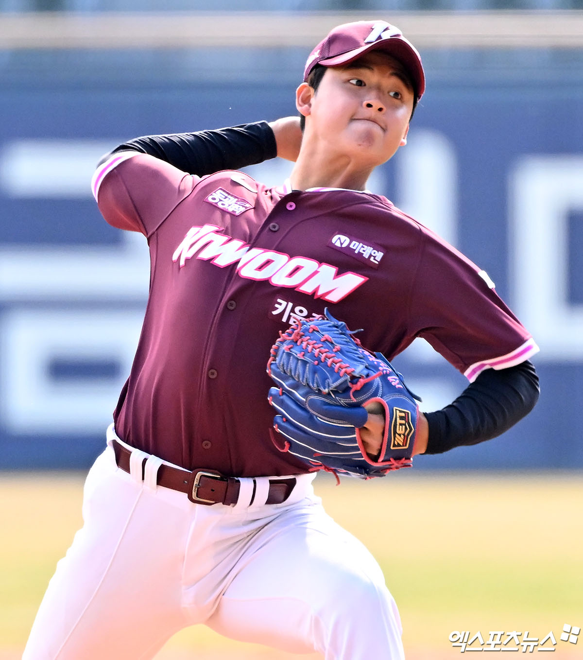 (엑스포츠뉴스 잠실, 김한준 기자) 23일 오후 서울 송파구 잠실야구장에서 열린 '2026 신한 SOL Bank KBO리그' 키움 히어로즈와 LG 트윈스의 시범경기, 7회말 키움 박준현이 공을 힘차게 던지고 있다.
