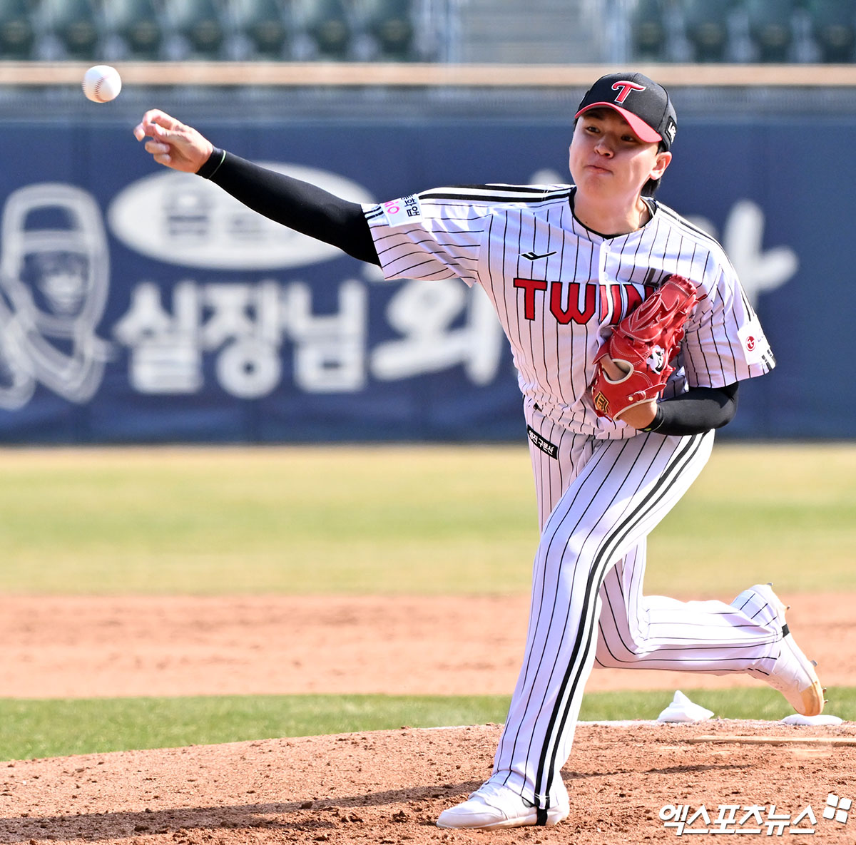 (엑스포츠뉴스 잠실, 김한준 기자) 23일 오후 서울 송파구 잠실야구장에서 열린 '2026 신한 SOL Bank KBO리그' 키움 히어로즈와 LG 트윈스의 시범경기, 8회초 LG 이민호가 공을 힘차게 던지고 있다.
