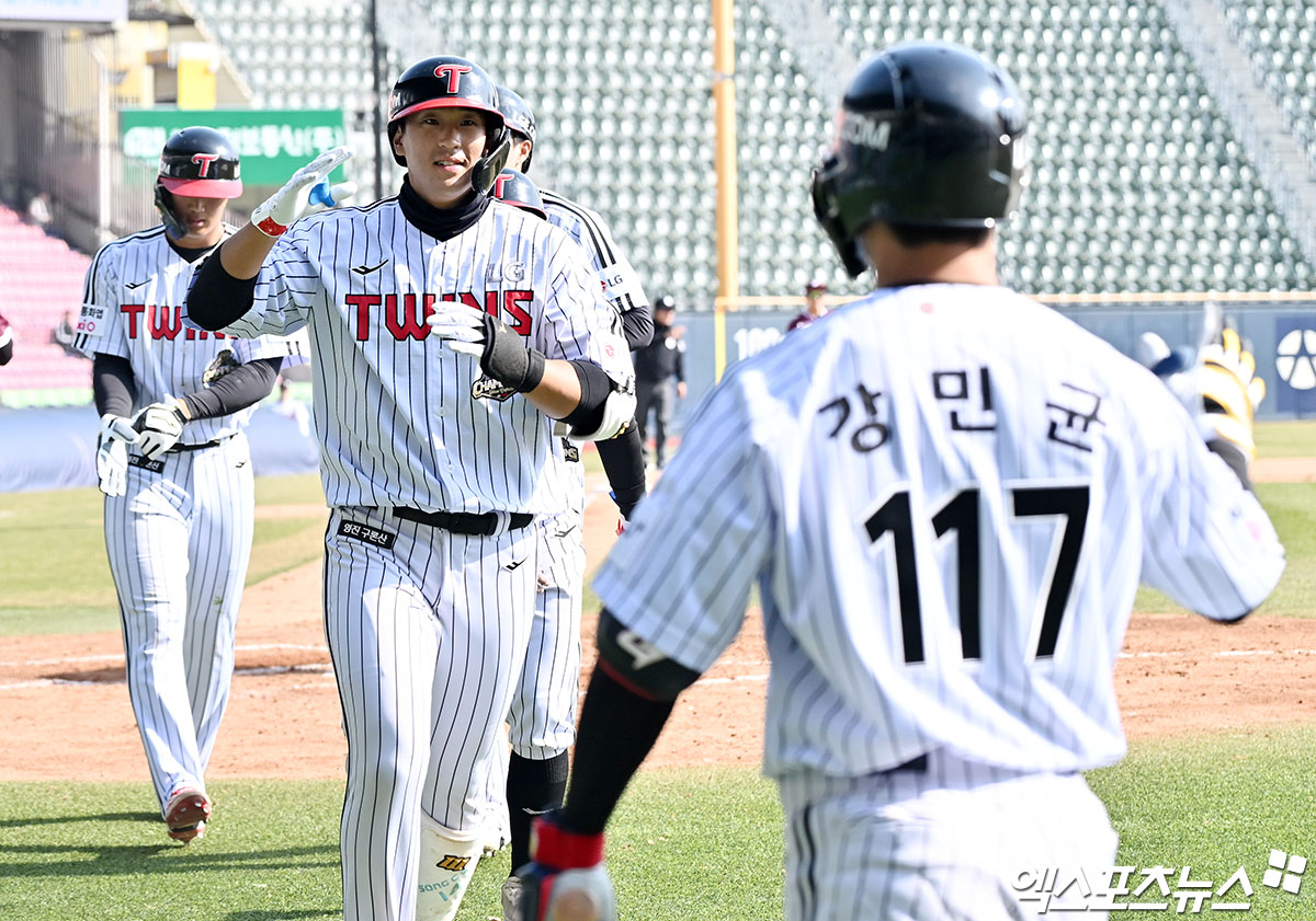 (엑스포츠뉴스 잠실, 김한준 기자) 23일 오후 서울 송파구 잠실야구장에서 열린 '2026 신한 SOL Bank KBO리그' 키움 히어로즈와 LG 트윈스의 시범경기, 7회말 2사 만루 LG 송찬의가 만루 홈런을 날린 후 기뻐하고 있다.
