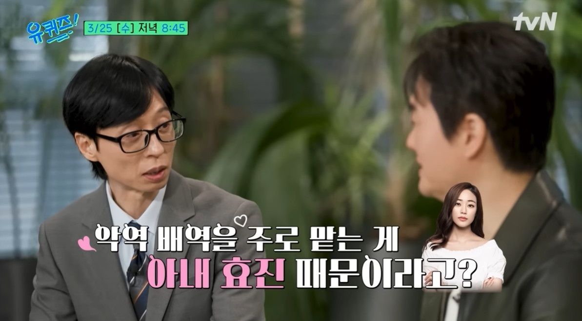 유재석은 "멜로보다 악역을 많이 하는 게 효진 씨 때문이라는 얘기가 있다"고 질문했다. 이에 대해서도 유지태는 "너무 미화되는 거 같다"며 말을 이어가 유재석을 빵 터지게 했다.