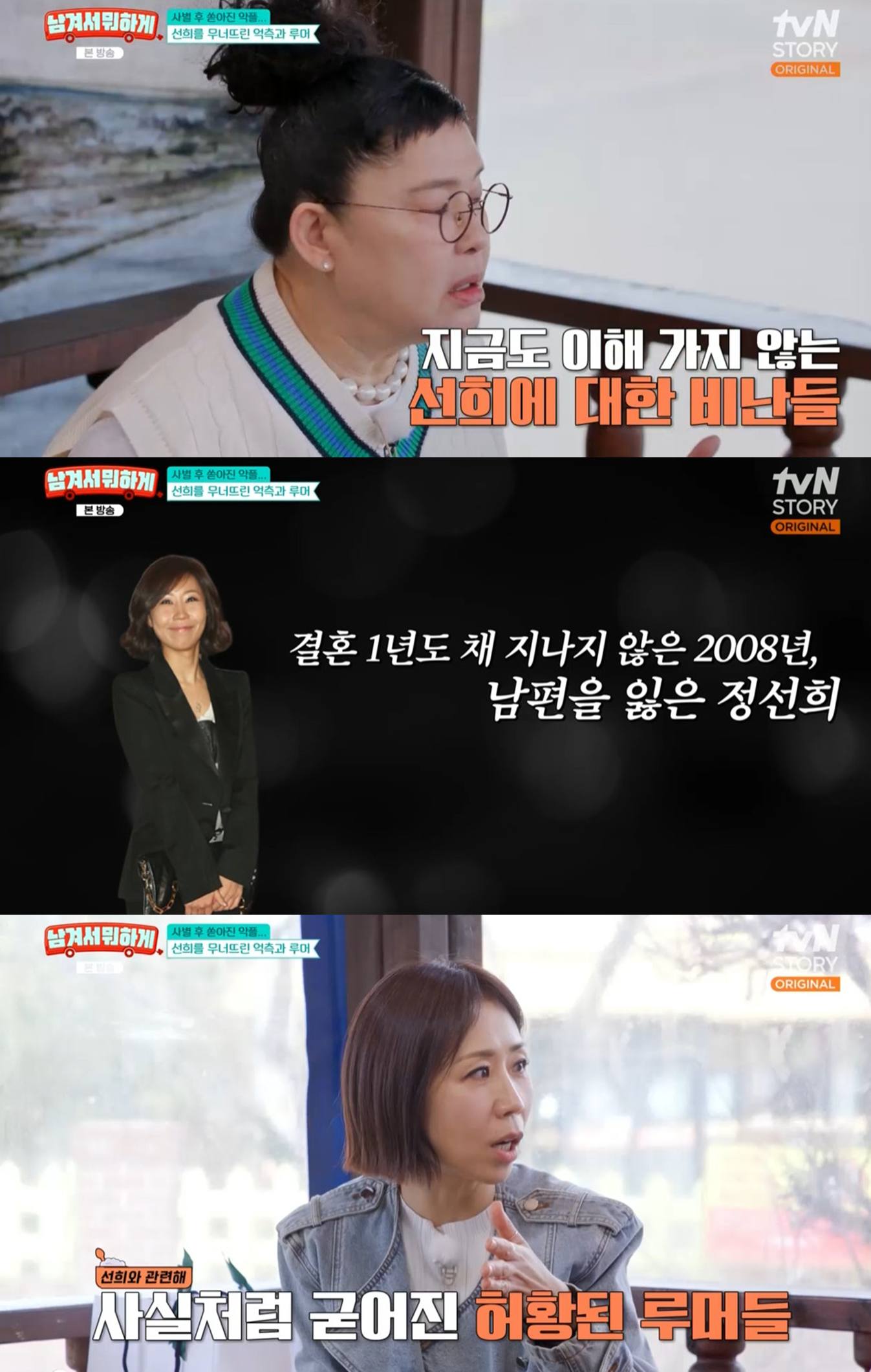 이영자는 정선희의 사별에 "선희가 당사자니까 많이 힘들었지"라며 안타까워했고, 정선희 또한 당시를 떠올리며 쉽게 꺼낼 수 없었던 상처를 다시 마주했다.