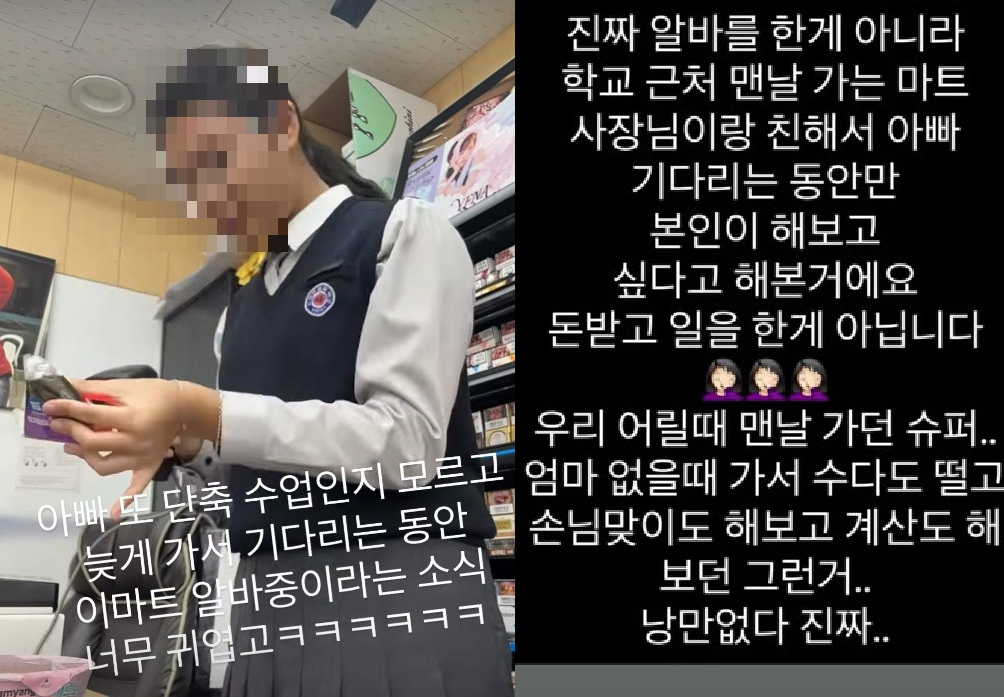 그는 "아빠 또 단축 수업인지 모르고 늦게 가서 기다리는 동안 이마트 알바 중이라는 소식 너무 귀엽고"라는 글을 덧붙이며 딸이 아빠를 기다리며 아르바이트 체험 중임을 밝힌 바 있다.