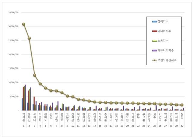4위, 이준혁 브랜드는 참여지수 2,013,228 미디어지수 2,683,644 소통지수 1,892,027 커뮤니티지수 2,948,238이 되면서 브랜드평판지수 9,537,137로 분석됐다.​