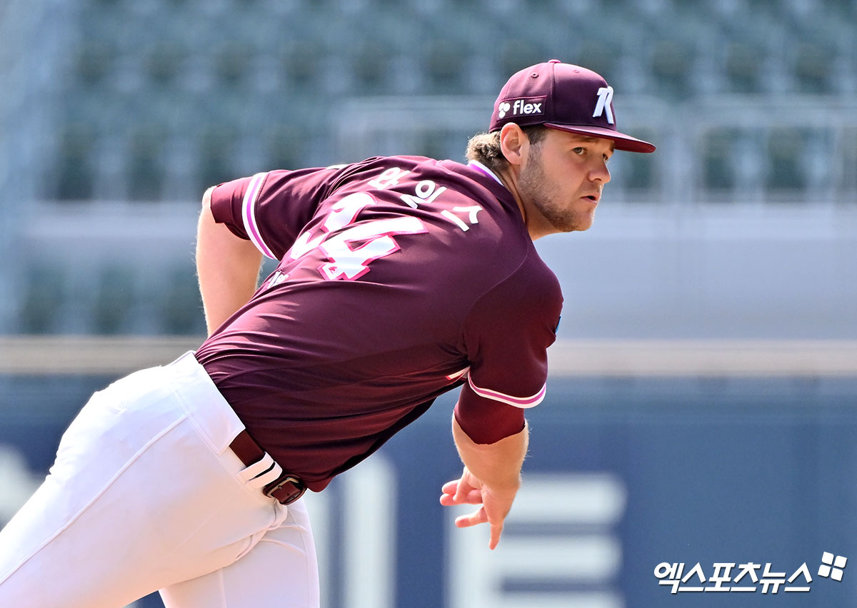 (엑스포츠뉴스 잠실, 김한준 기자) 24일 오후 서울 송파구 잠실야구장에서 열린 '2026 신한 SOL Bank KBO리그' 키움 히어로즈와 LG 트윈스의 시범경기, 1회말 키움 와일스가 공을 힘차게 던지고 있다.