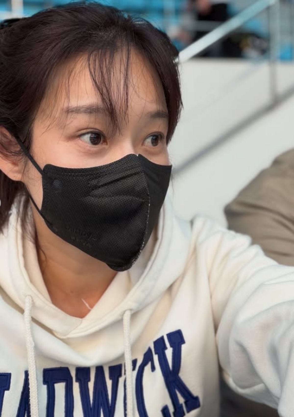 사진 속 현영은 현재 수영선수로 활약 중인 첫째 딸을 응원하기 위해 직접 수영장을 찾았다.