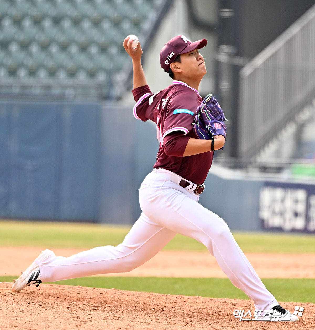 (엑스포츠뉴스 잠실, 김한준 기자) 24일 오후 서울 송파구 잠실야구장에서 열린 '2026 신한 SOL Bank KBO리그' 키움 히어로즈와 LG 트윈스의 시범경기, 9회말 1사 만루 키움 박정훈이 공을 힘차게 던지고 있다.