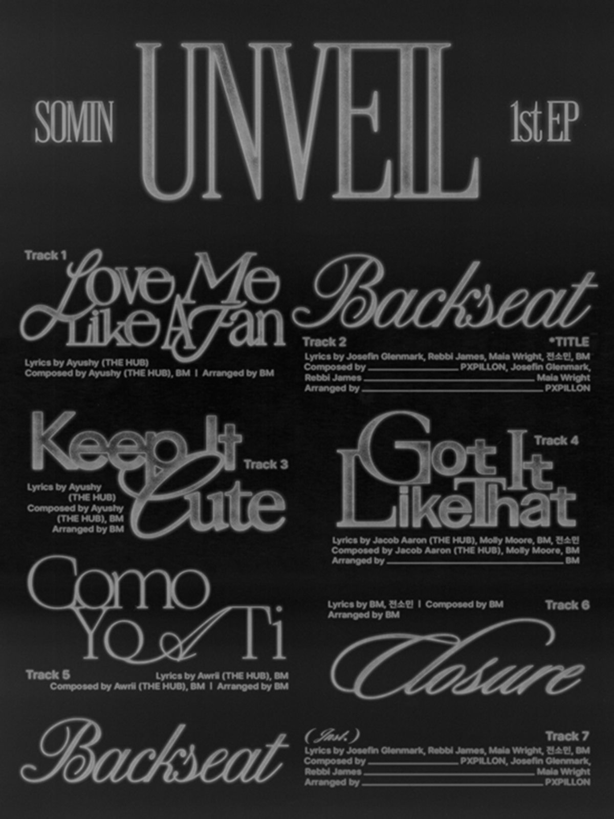이에 따르면, 이번 EP에는 타이틀곡 'Backseat(백시트)'를 포함해 'Love Me Like A Fan(러브 미 라이크 어 팬)', 'Keep It Cute(킵 잇 큐트)', 'Got It Like That(갓 잇 라이크 댓)', 'Como Yo A Ti(꼬모 요 아 띠)', 'Closure(클로저)', 'Backseat (Inst.)'까지 총 7곡이 수록됐다.