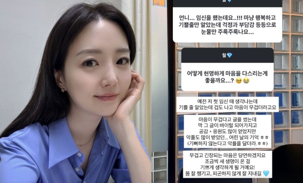 임신을 했다는 한 누리꾼은 김소영에게 "마냥 행복하고 기쁠 줄만 알았는데 걱정과 부담감으로 눈물만 주룩주룩 난다"는 속내를 털어놓았다.