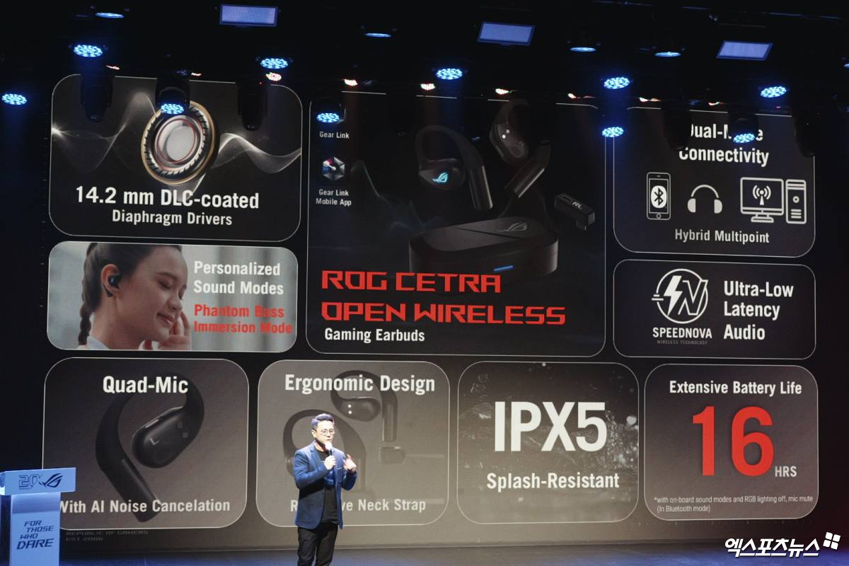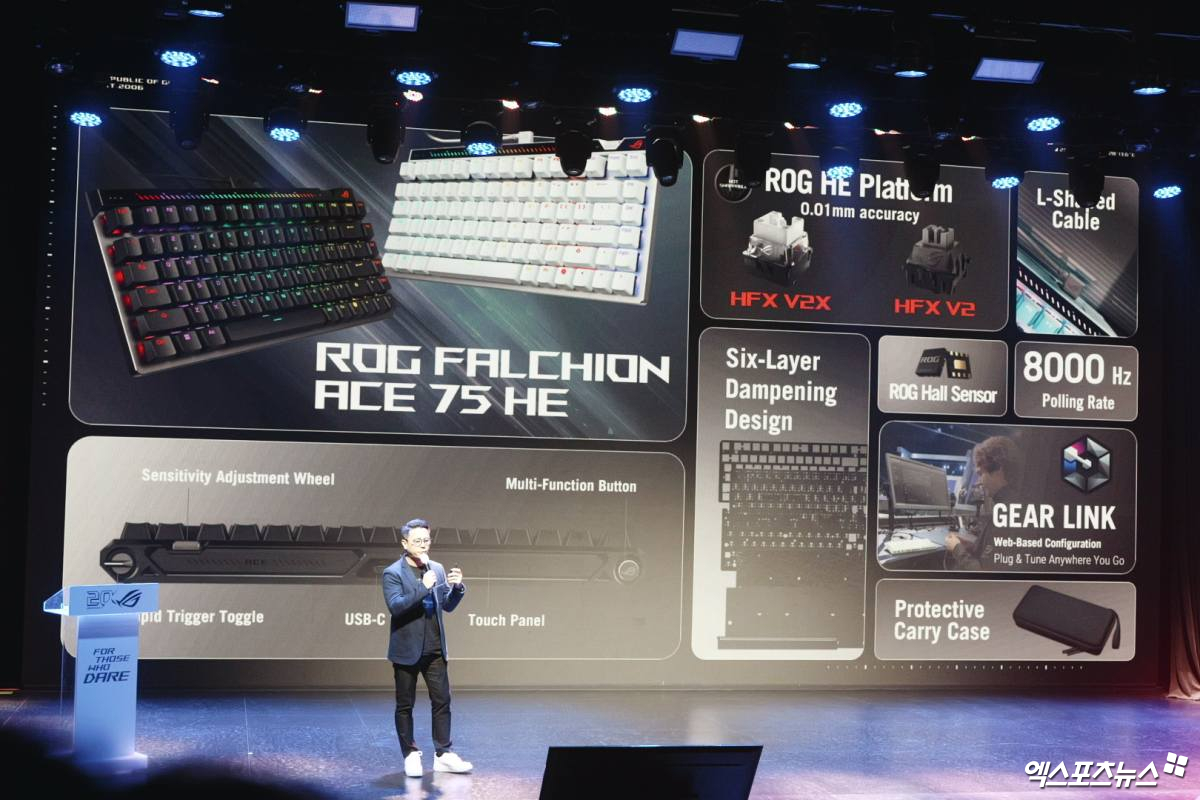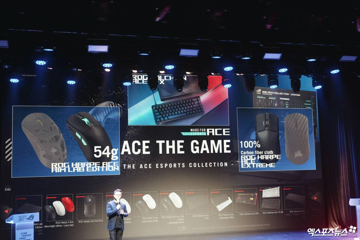 양선일 대표의 게임단 소개가 마무리되자 이슨 리(Eason Lee) 에이수스 디렉터가 ROG의 신규 게이밍 기어를 소개했다. 그는 게이밍 마우스 'ROG HARPE II ACE', 게이밍 키보드 'ROG FALCHION ACE 75 HE'와 'ROG STRIX MORPH 96 WIRELESS', 게이밍 헤드셋 'ROG KITHARA', 오픈형 게이밍 이어폰 'ROG CETRA OPEN WIRELESS’ 등을 차례로 소개해 눈길을 끌었다.
