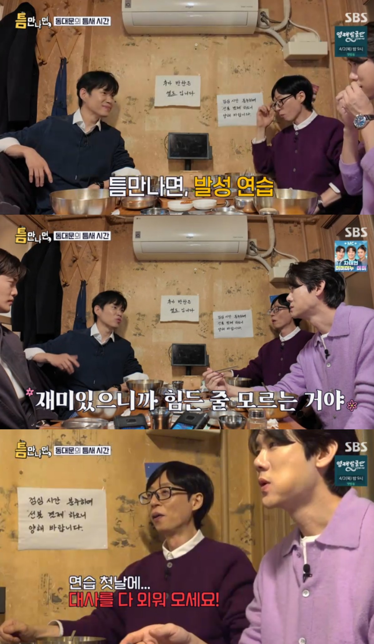 이후 이들은 식당으로 이동해 점심 식사를 했다. 유준상은 밥을 먹는 도중에도 갑자기 뮤지컬 발성 연습을 하면서 열정맨의 모습을 보여줬다.