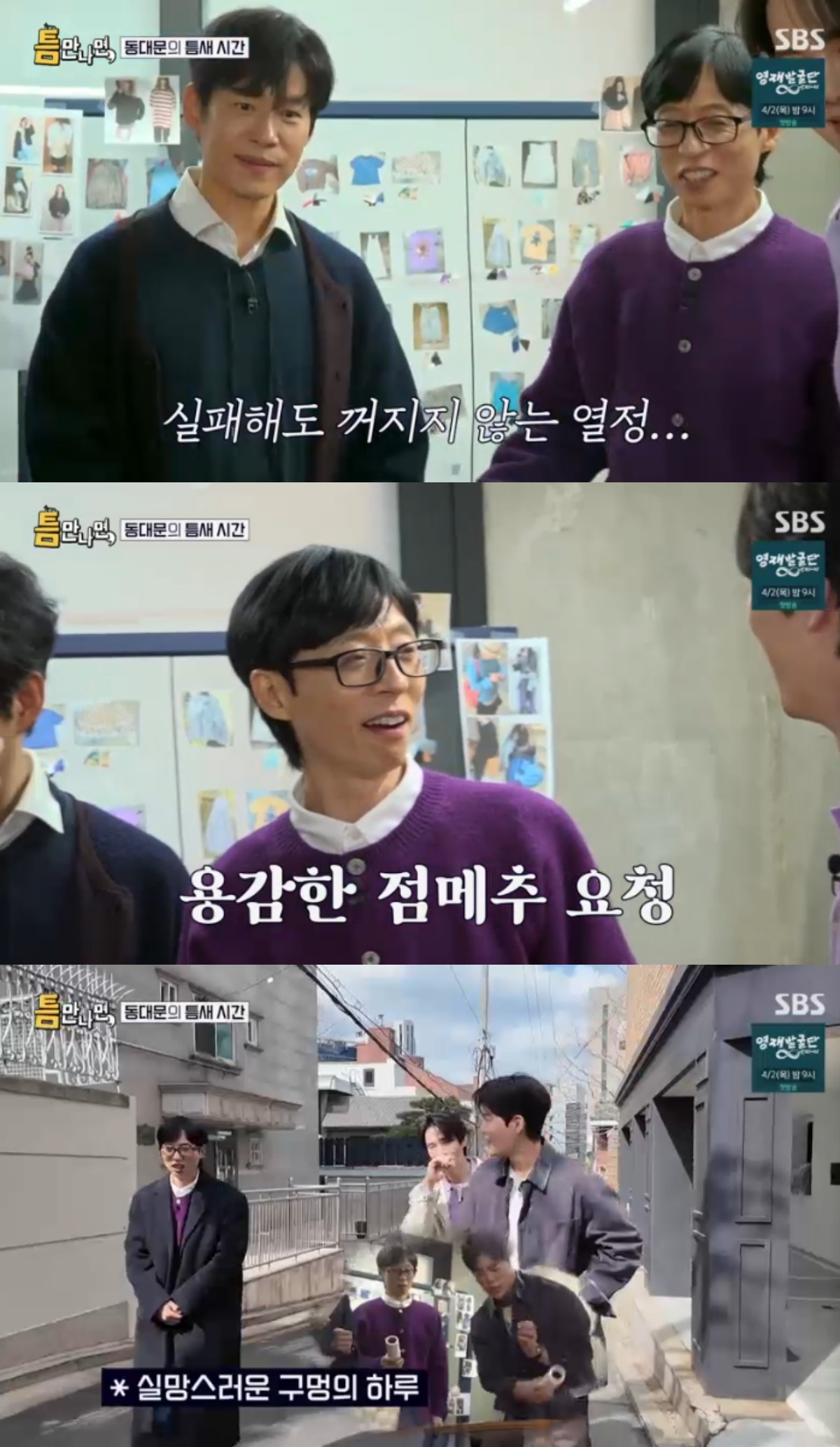 24일 방송된 SBS 예능 프로그램 '틈만 나면, 시즌4'에서는 '틈 친구'로 배우 유준상, 김건우가 출연해 유재석, 유연석과 함께 창신동을 찾아 '틈 주인'에게 행운을 선물했다.