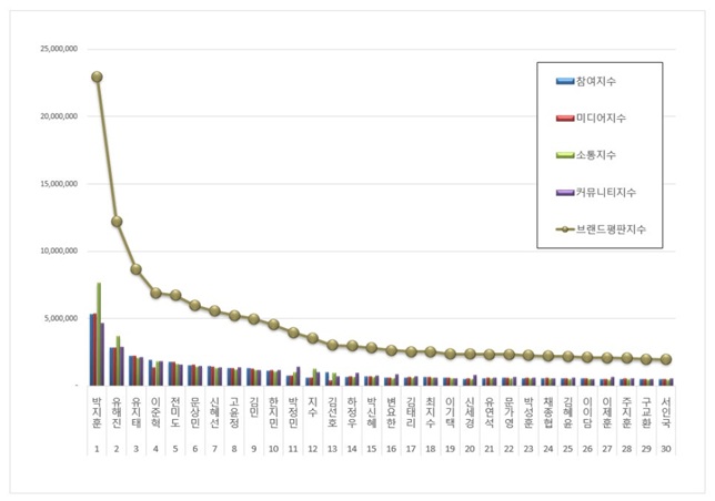 4위, 이준혁 브랜드는 참여지수 1,924,096 미디어지수 1,352,783 소통지수 1,796,410 커뮤니티지수 1,824,153이 되면서 브랜드평판지수 6,897,442로 분석됐다.