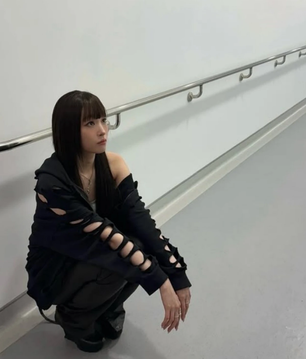 사진 속 애니는 컷아웃 디테일이 돋보이는 후드 집업을 착용하고 올블랙 스타일로 강렬한 분위기를 완성했다.