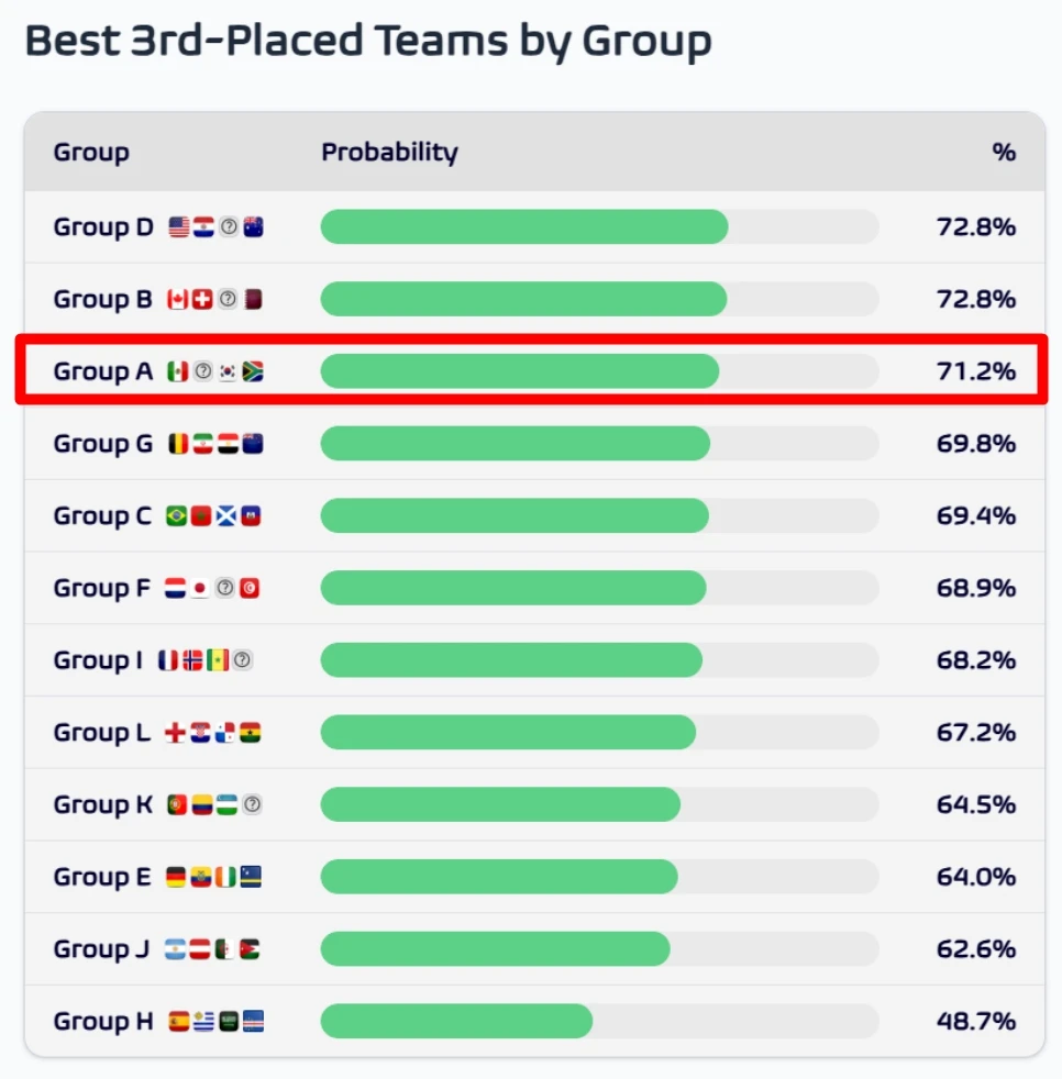 매체에 따르면 한국이 속한 A조는 조 3위 팀이 32강에 진출할 확률이 71.2%에 달했다. 이보다 확률이 높은 조는 B조와 D조(이상 72.8%)뿐이다.