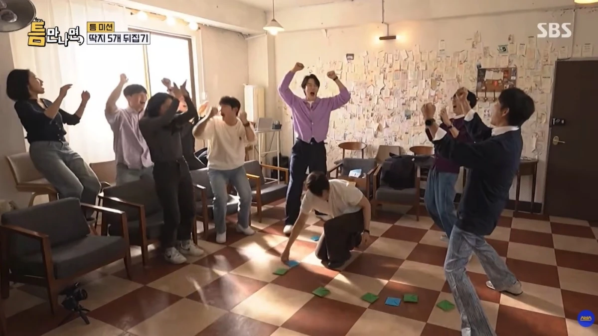 두 번째 틈 미션은 한 명씩 딱지를 넘기는 ‘딱지치기’였다. 여기서 ‘딱지왕’ 유재석의 클래스가 빛을 발했다. 유재석은 “중심을 맞혀야 돼”라며 노하우를 전수했고, 유재석의 구령에 맞춰 모두가 일사불란하게 연습에 매진했다.