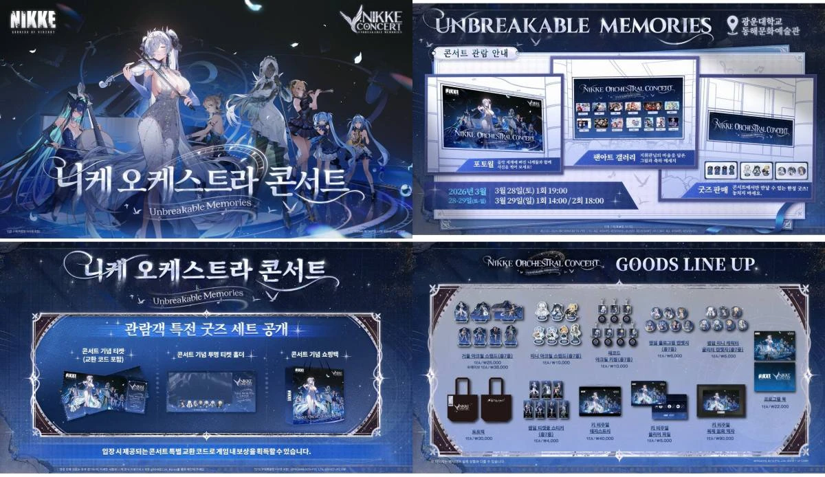 이번 공연은 3월 28일(토) 오후 7시, 29일(일) 오후 2시와 6시 총 3회 차 로 진행된다. 팬들은 오케스트라 사운드로 재해석된 '승리의 여신: 니케'의 음악 총 30곡을 2부에 걸쳐 약 2시간 10분 동안 감상할 수 있다. 준비된 곡으로는 스토리 이벤트 수록곡 'Set Sail', 'Rising Higher', 주년 이벤트 테마곡 'THE RED HOOD', 'The Clarion Call', 'Unbreakable Sphere' 등이 있다.