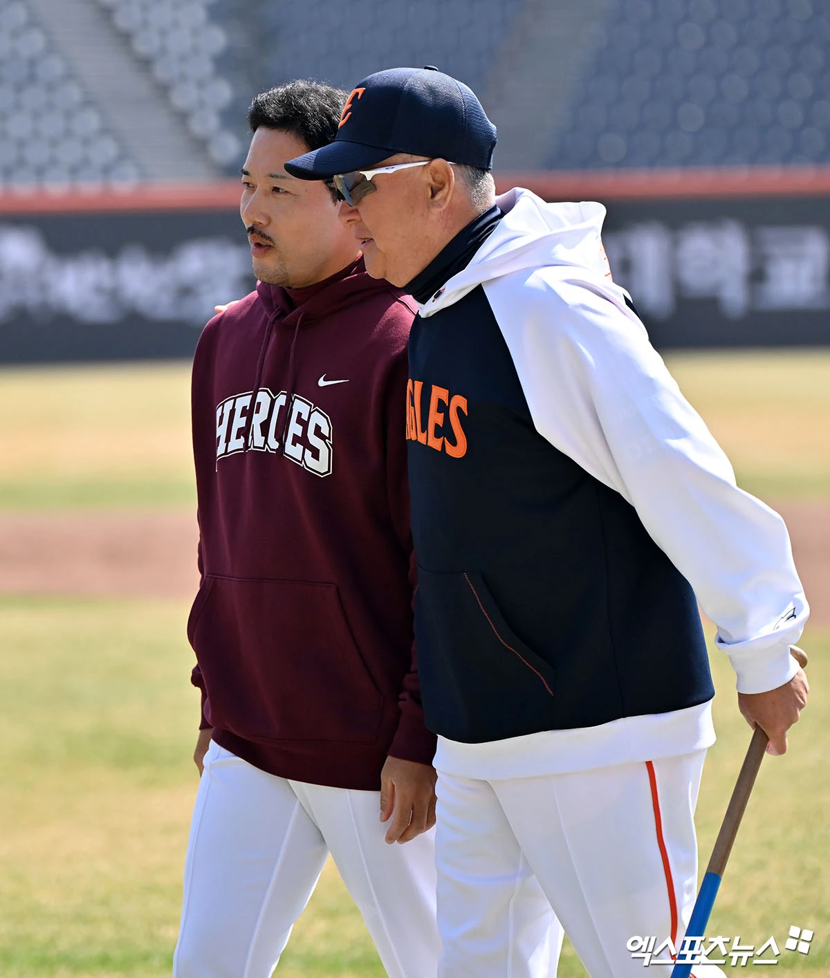 (엑스포츠뉴스 대전, 김한준 기자) 28일 오후 대전 한화생명 볼파크에서 열리는 '2026 신한 SOL Bank KBO리그' 키움 히어로즈와 한화 이글스의 경기, 한화 김경문 감독이 키움 이용규 플레잉코치와 대화를 나누고 있다.
