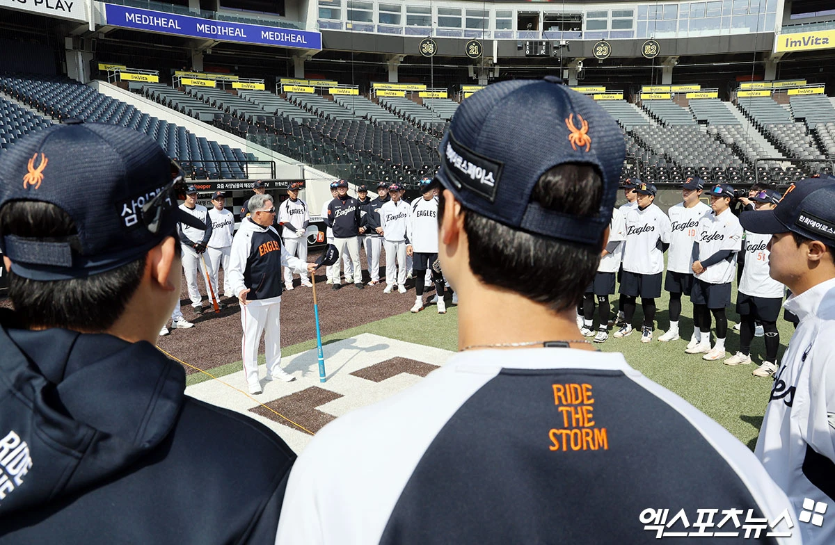 (엑스포츠뉴스 대전, 김한준 기자) 28일 오후 대전 한화생명 볼파크에서 열리는 '2026 신한 SOL Bank KBO리그' 키움 히어로즈와 한화 이글스의 경기, 한화 김경문 감독이 선수단 미팅을 갖고 있다.