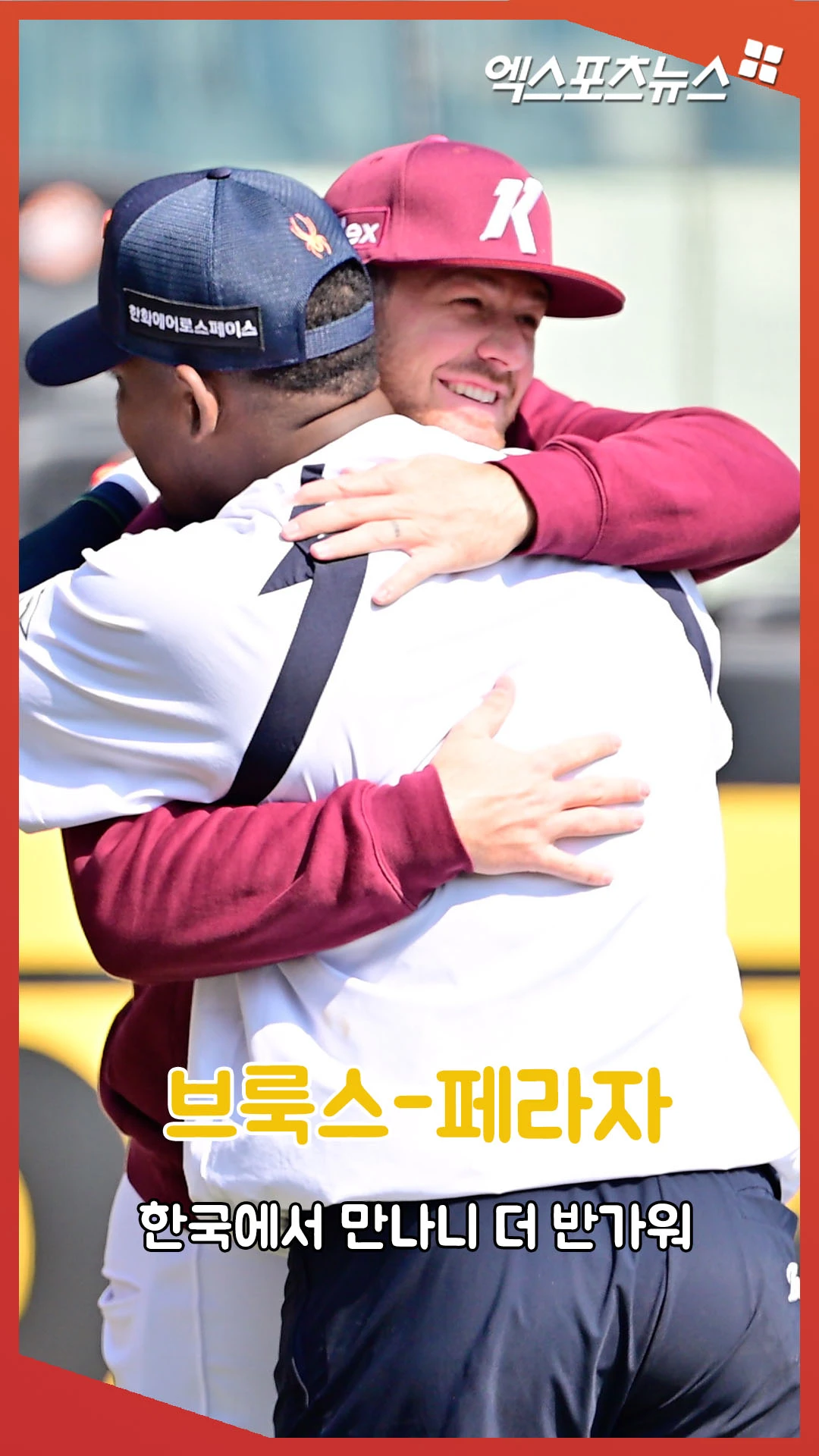 (엑스포츠뉴스 대전, 김한준 기자) 28일 오후 대전 한화생명 볼파크에서 열리는 '2026 신한 SOL Bank KBO리그' 키움 히어로즈와 한화 이글스의 경기, 키움 브룩스와 한화 페라자가 만나 반갑게 인사를 나누고 있다.