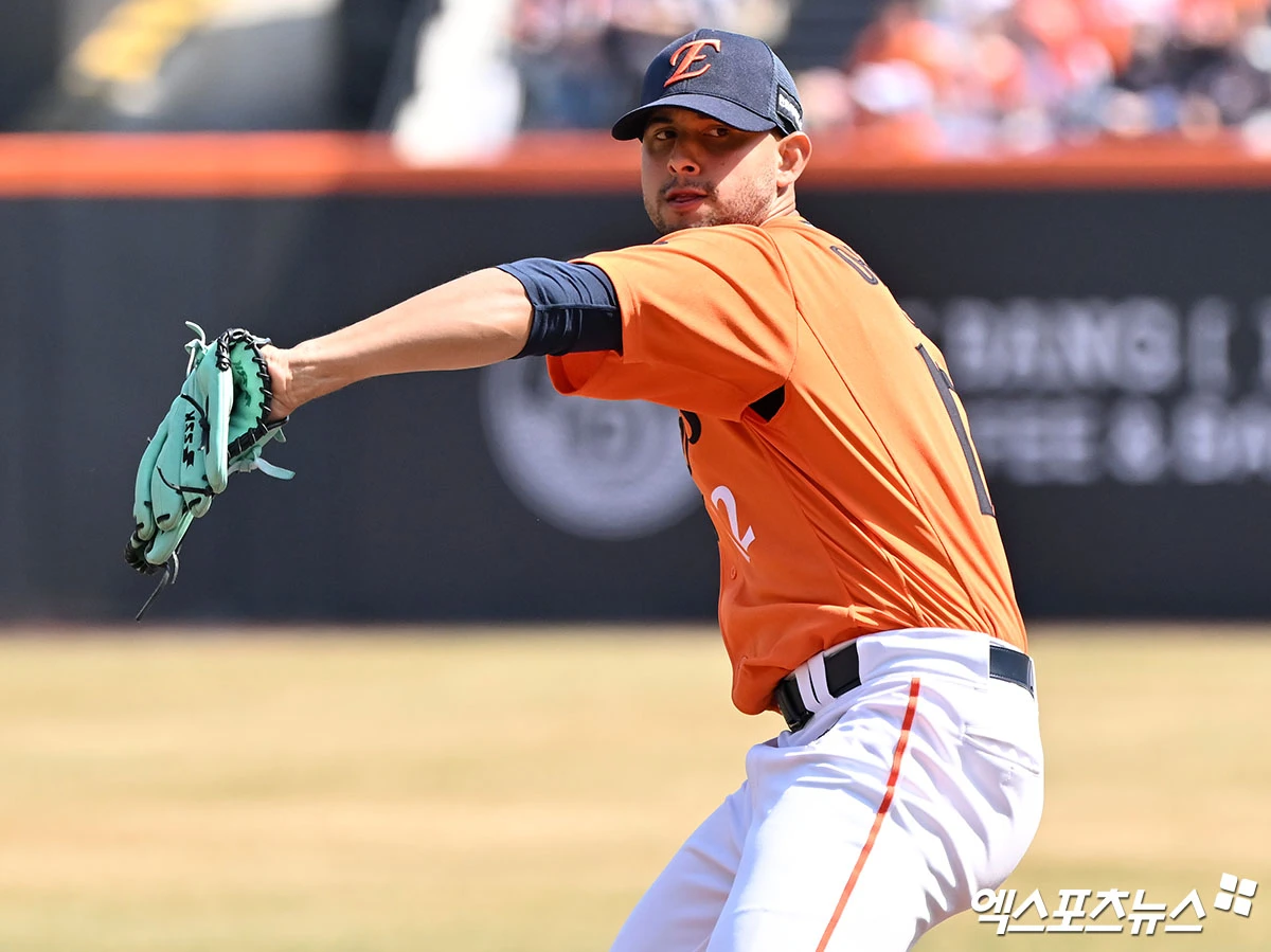(엑스포츠뉴스 대전, 김한준 기자) 28일 오후 대전 한화생명 볼파크에서 열린 '2026 신한 SOL Bank KBO리그' 키움 히어로즈와 한화 이글스의 개막전 경기, 1회초 한화 선발투수 에르난데스가 공을 힘차게 던지고 있다.