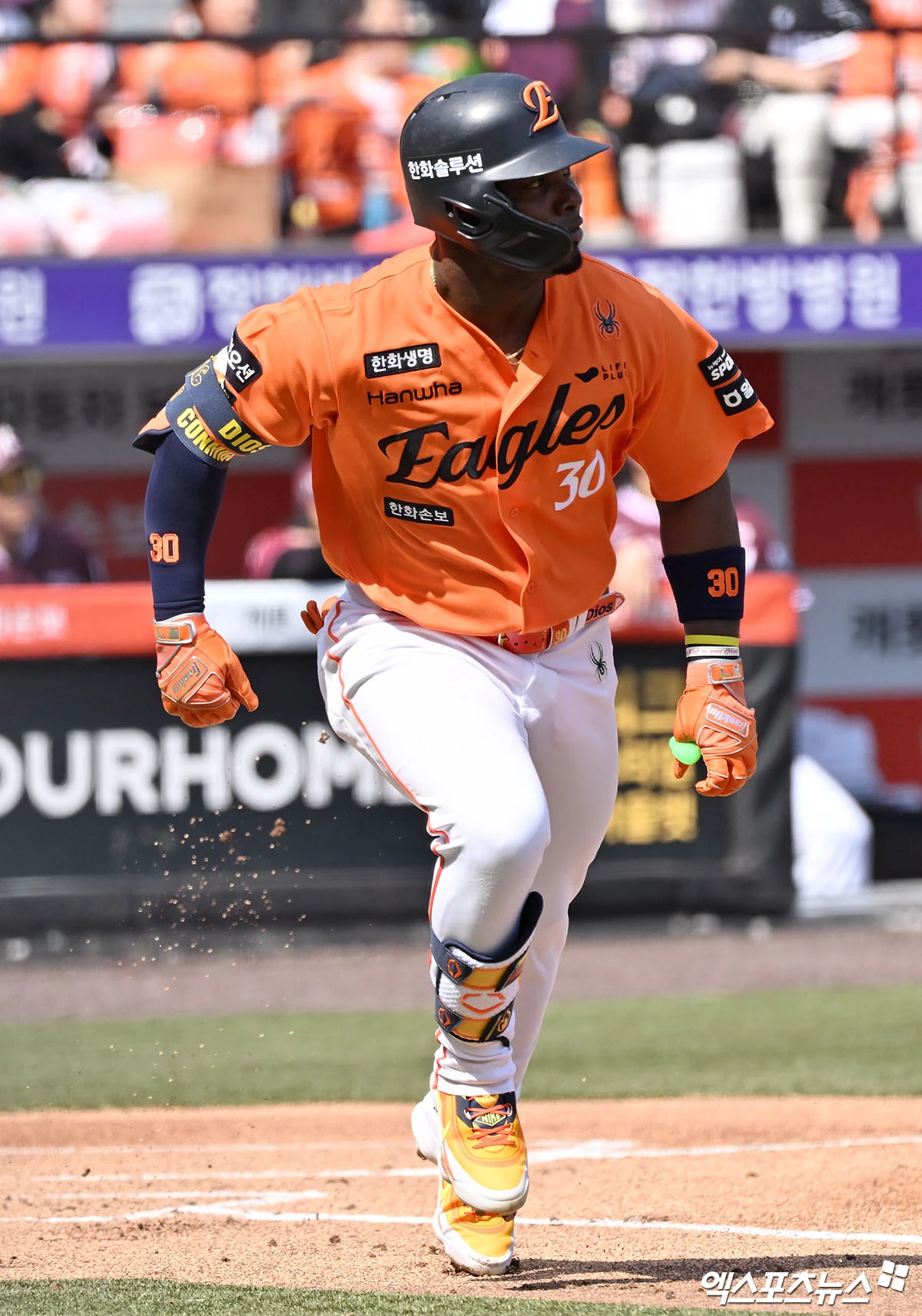 (엑스포츠뉴스 대전, 김한준 기자) 28일 오후 대전 한화생명 볼파크에서 열린 '2026 신한 SOL Bank KBO리그' 키움 히어로즈와 한화 이글스의 개막전 경기, 1회말 1사 한화 페라자가 중전안타를 날리고 있다.