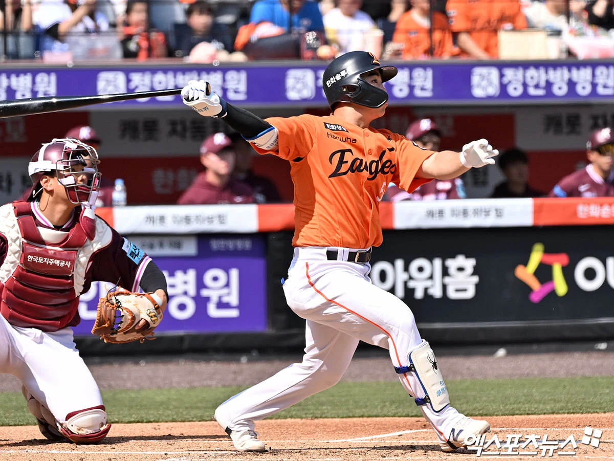 (엑스포츠뉴스 대전, 김한준 기자) 28일 오후 대전 한화생명 볼파크에서 열린 '2026 신한 SOL Bank KBO리그' 키움 히어로즈와 한화 이글스의 개막전 경기, 1회말 1사 1루 한화 문현빈이 2루타를 날리고 있다.