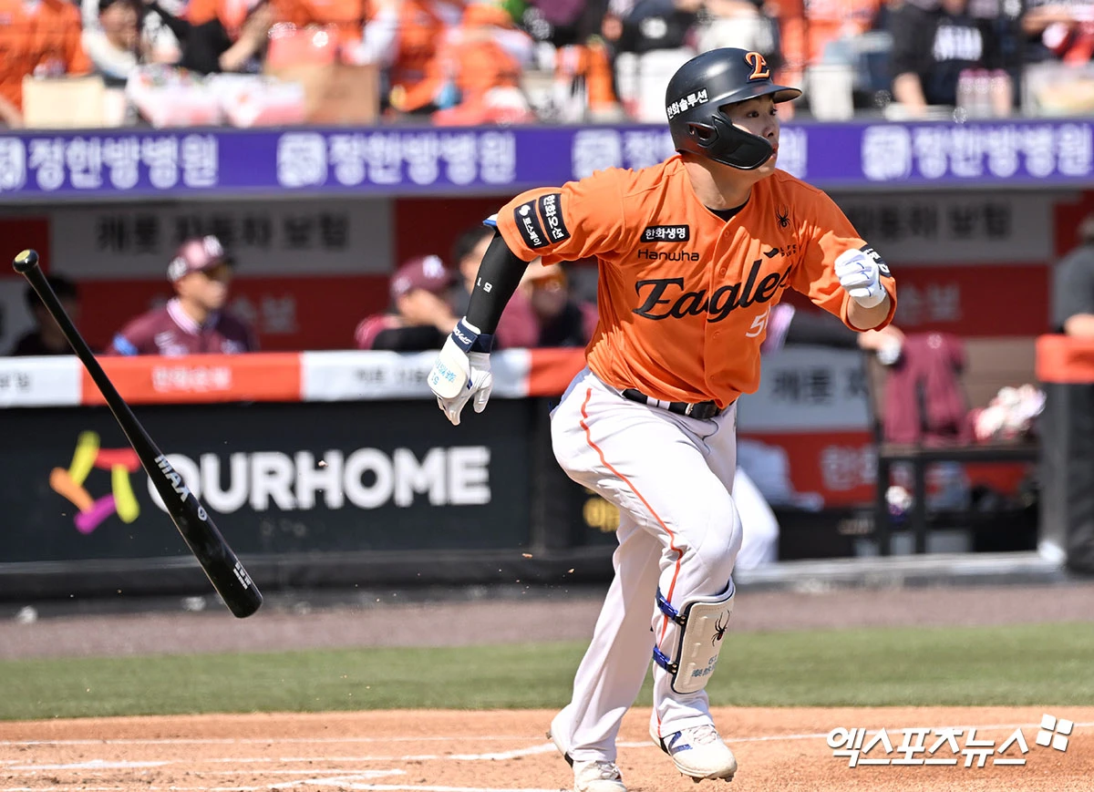 (엑스포츠뉴스 대전, 김한준 기자) 28일 오후 대전 한화생명 볼파크에서 열린 '2026 신한 SOL Bank KBO리그' 키움 히어로즈와 한화 이글스의 개막전 경기, 1회말 1사 1루 한화 문현빈이 2루타를 날리고 있다.