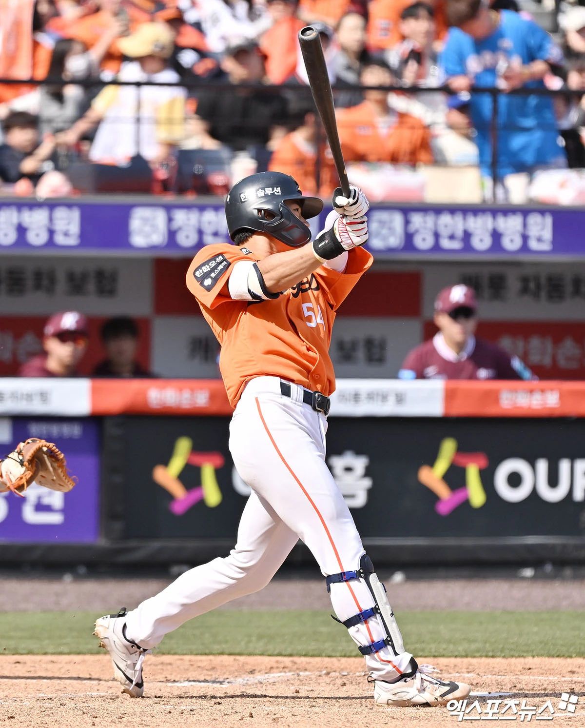 (엑스포츠뉴스 대전, 김한준 기자) 28일 오후 대전 한화생명 볼파크에서 열린 '2026 신한 SOL Bank KBO리그' 키움 히어로즈와 한화 이글스의 개막전 경기, 3회말 1사 한화 오재원이 좌전안타를 날리고 있다.