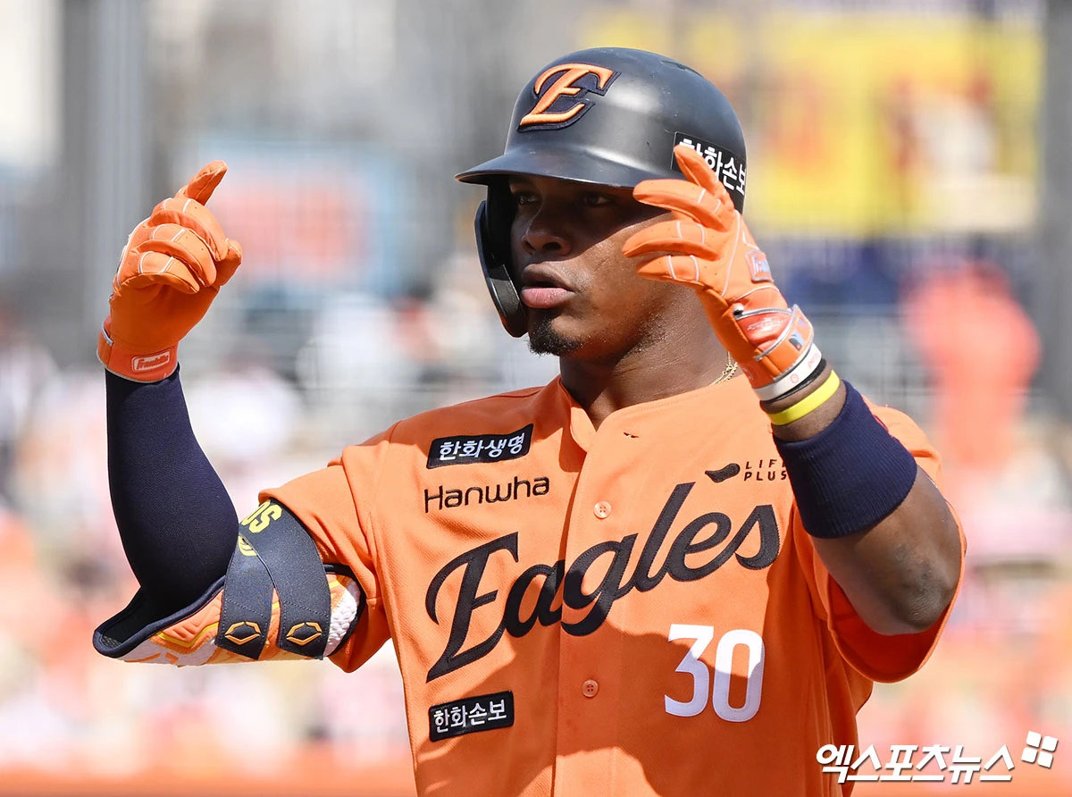 (엑스포츠뉴스 대전, 김한준 기자) 28일 오후 대전 한화생명 볼파크에서 열린 '2026 신한 SOL Bank KBO리그' 키움 히어로즈와 한화 이글스의 개막전 경기, 3회말 1사 1루 한화 페라자가 우전안타를 날리고 있다.
