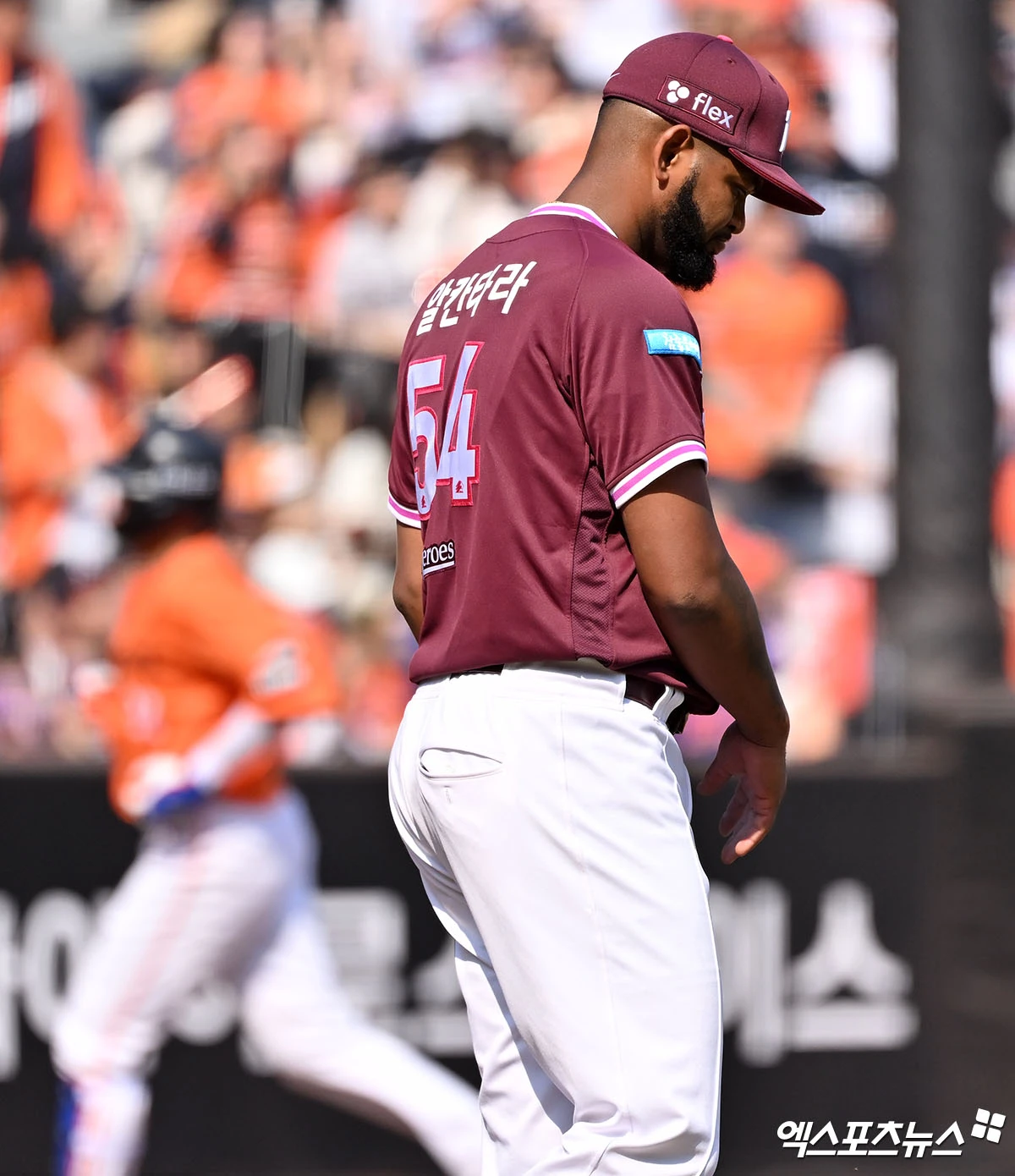 (엑스포츠뉴스 대전, 김한준 기자) 28일 오후 대전 한화생명 볼파크에서 열린 '2026 신한 SOL Bank KBO리그' 키움 히어로즈와 한화 이글스의 개막전 경기, 4회말 1사 키움 알칸타라가 한화 채은성에게 솔로 홈런을 허용한 후 아쉬워하고 있다.