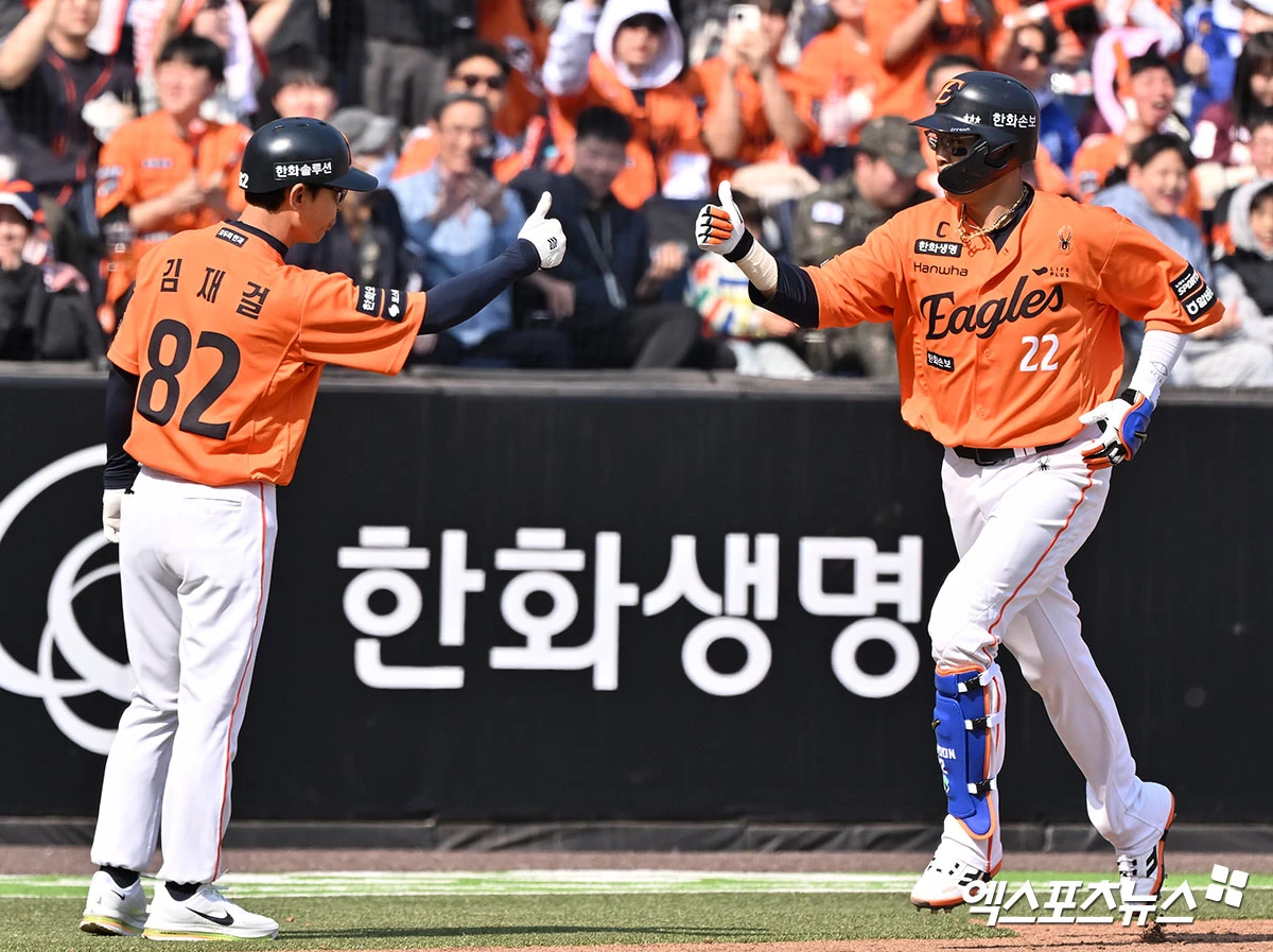 (엑스포츠뉴스 대전, 김한준 기자) 28일 오후 대전 한화생명 볼파크에서 열린 '2026 신한 SOL Bank KBO리그' 키움 히어로즈와 한화 이글스의 개막전 경기, 4회말 1사 한화 채은성이 솔로 홈런을 날린 후 기뻐하고 있다.