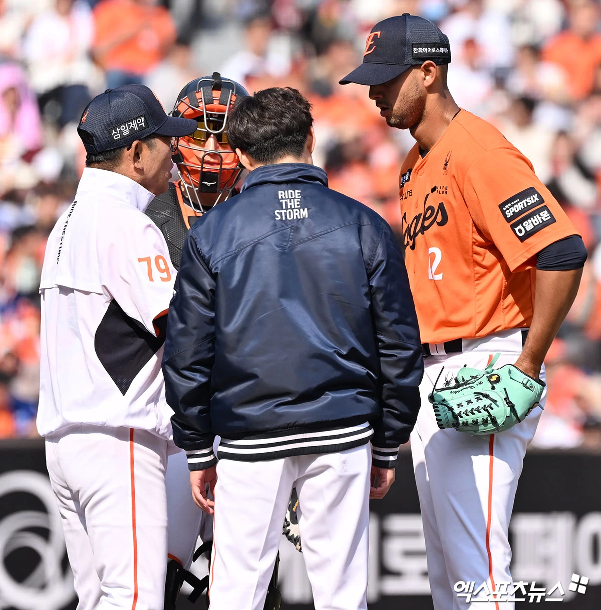 (엑스포츠뉴스 대전, 김한준 기자) 28일 오후 대전 한화생명 볼파크에서 열린 '2026 신한 SOL Bank KBO리그' 키움 히어로즈와 한화 이글스의 개막전 경기, 5회초 무사 1,2루 한화 양상문 코치가 마운드를 방문하고 있다.