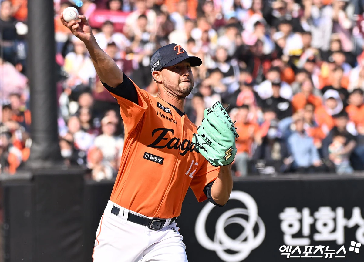 (엑스포츠뉴스 대전, 김한준 기자) 28일 오후 대전 한화생명 볼파크에서 열린 '2026 신한 SOL Bank KBO리그' 키움 히어로즈와 한화 이글스의 개막전 경기, 5회초 1사 만루 한화 에르난데스가 키움 이주형의 타구를 처리하고 있다.